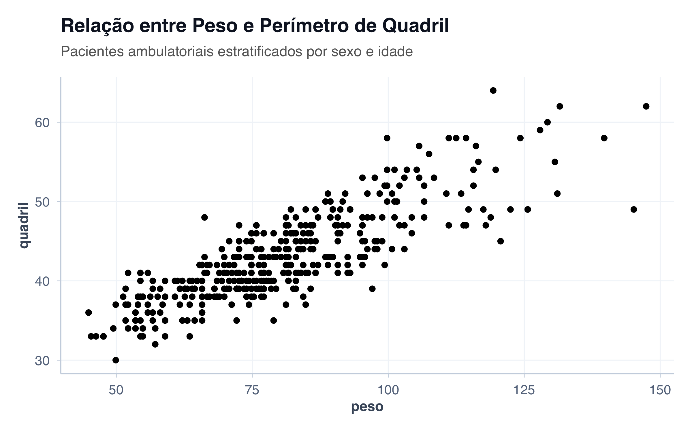 # Exemplo com ggplot2ggplot(pacientes, aes(x = peso, y = quadril)) +geom_point() +labs(title ="Relação entre Peso e Perímetro de Quadril",subtitle ="Pacientes ambulatoriais estratificados por sexo e idade" ) +theme(plot.title =element_text(face ="bold", size =16),plot.subtitle =element_text(color ="gray40", size =12) )