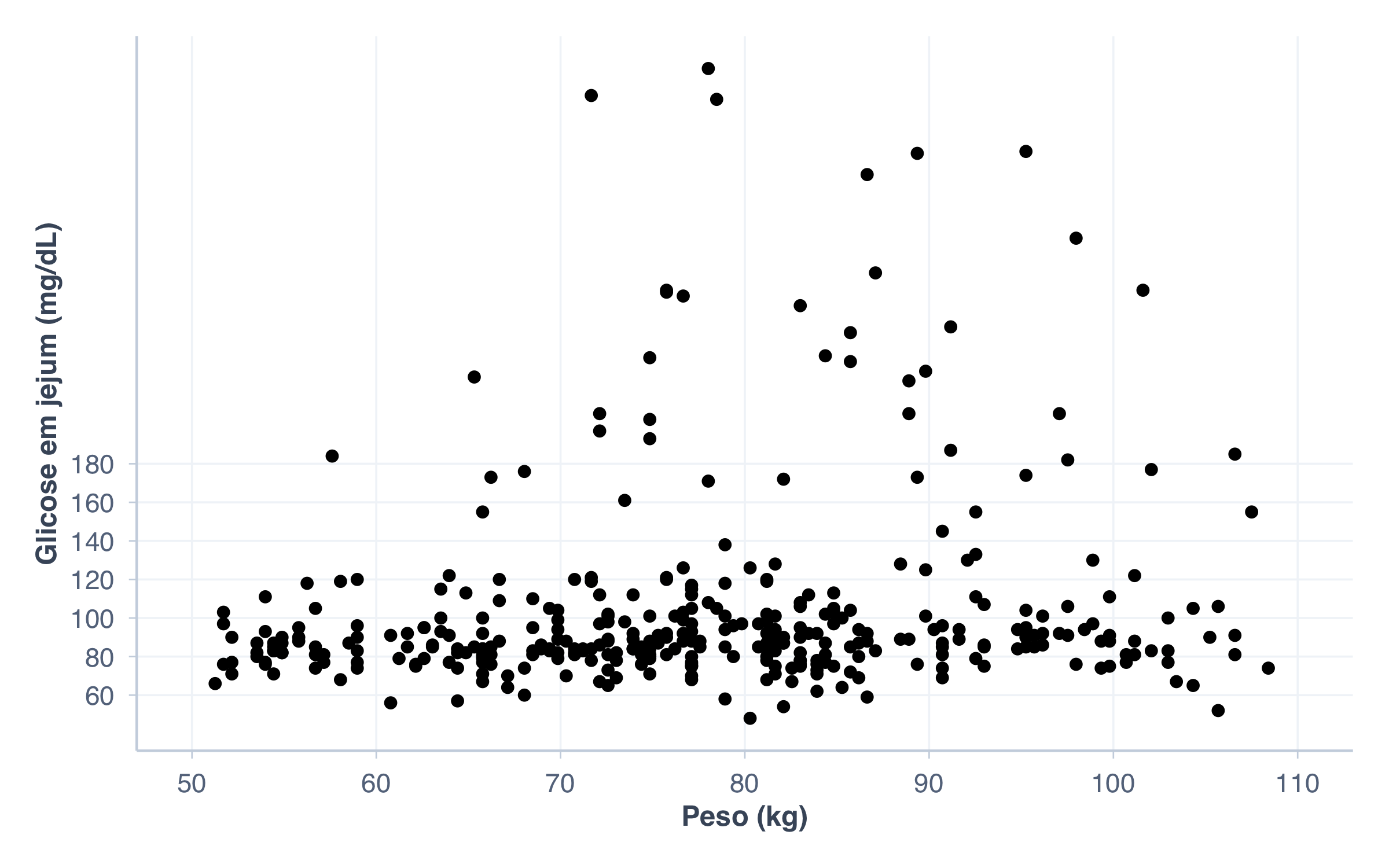 # Controle fino dos eixosggplot(pacientes, aes(x = peso, y = glicose)) +geom_point() +scale_x_continuous(name ="Peso (kg)",breaks =seq(50, 110, by =10),limits =c(50, 110) ) +scale_y_continuous(name ="Glicose em jejum (mg/dL)",breaks =seq(60, 180, by =20) )
