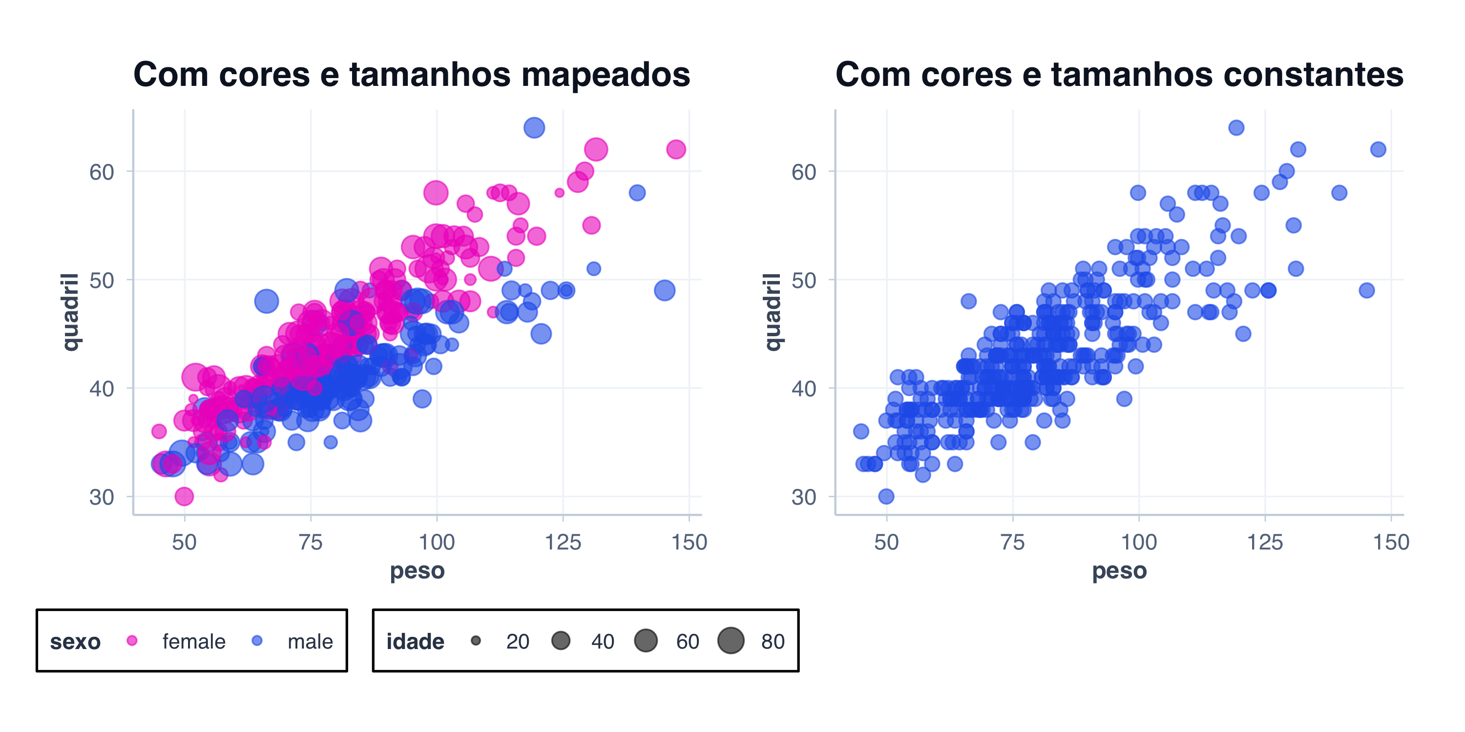 # Exemplo: múltiplas estéticas mapeadas a variáveisp1 <- pacientes |>ggplot(aes(x = peso, y = quadril, color = sexo, size = idade)) +geom_point(alpha =0.6) +scale_color_manual(values = paleta_sexo) +labs(title ="Com cores e tamanhos mapeados") +tema_graficos()# Exemplo: estética constantep2 <- pacientes |>ggplot(aes(x = peso, y = quadril)) +geom_point(color = cores$azul, size =3, alpha =0.6) +labs(title ="Com cores e tamanhos constantes") +tema_graficos()p1 | p2