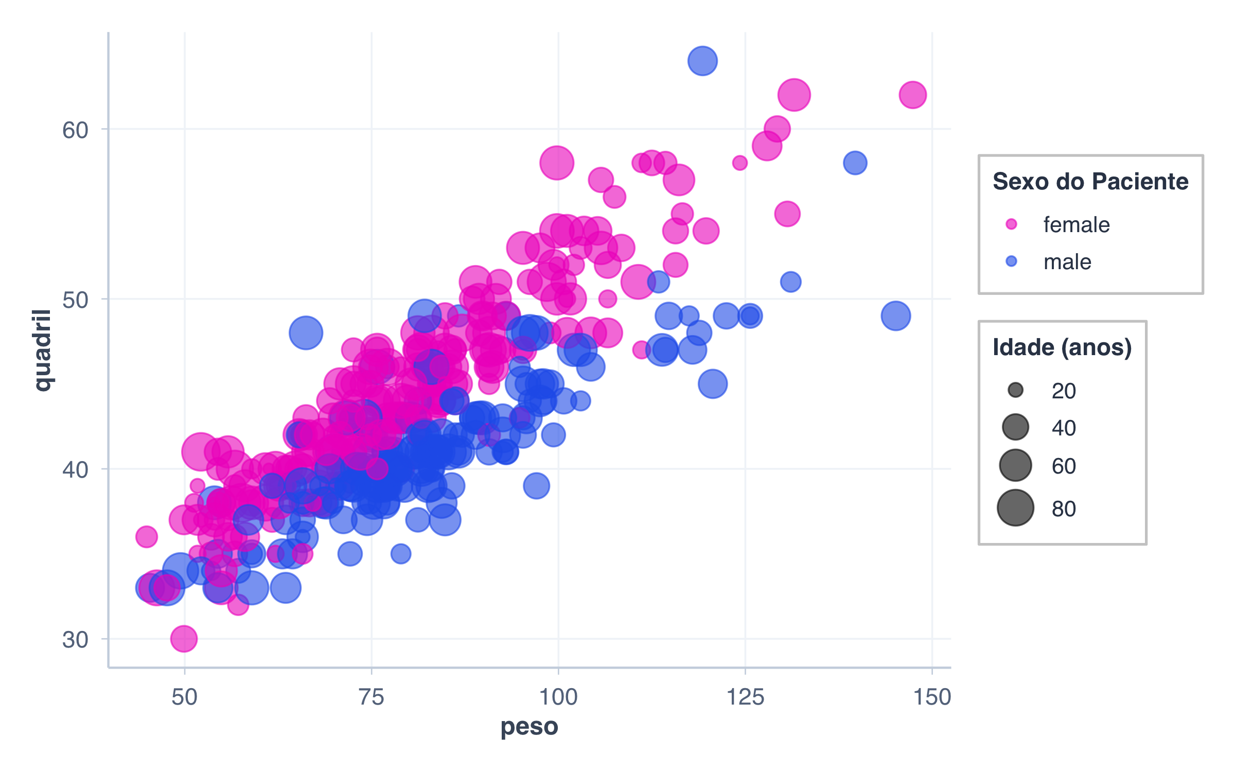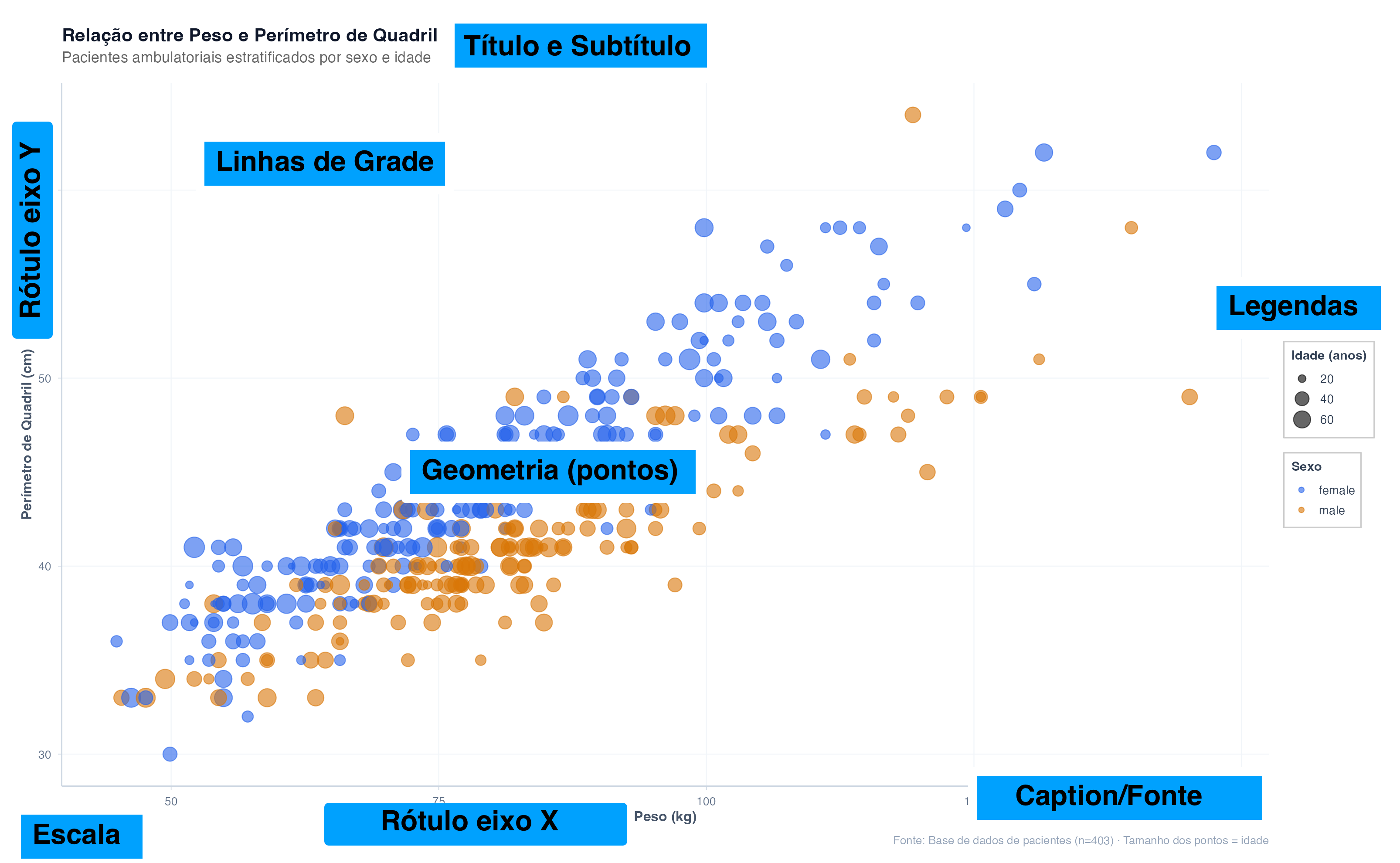 # Legenda customizadaggplot(pacientes, aes(x = peso, y = quadril, color = sexo, size = idade)) +geom_point(alpha =0.6) +scale_color_manual(values = paleta_sexo,name ="Sexo do Paciente" ) +scale_size_continuous(name ="Idade (anos)",range =c(2, 8) ) +theme(legend.position ="right",legend.background =element_rect(fill ="white", color ="gray80"),legend.title =element_text(face ="bold") )