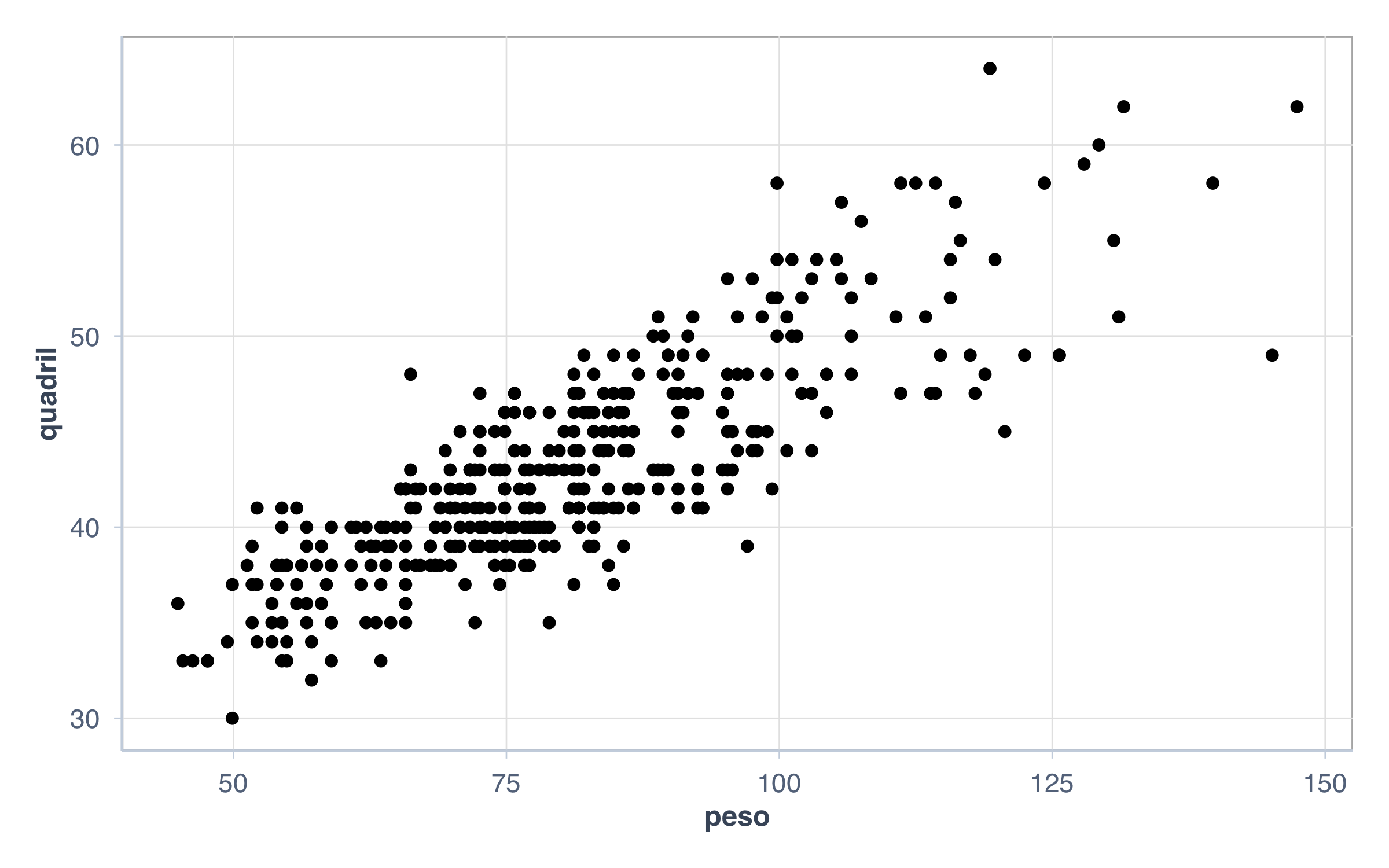 # Exemplo de controle fino de gridggplot(pacientes, aes(x = peso, y = quadril)) +geom_point() +theme(panel.grid.major =element_line(color ="gray90", size =0.3),panel.grid.minor =element_blank(),panel.background =element_rect(fill ="white", color ="gray70") )