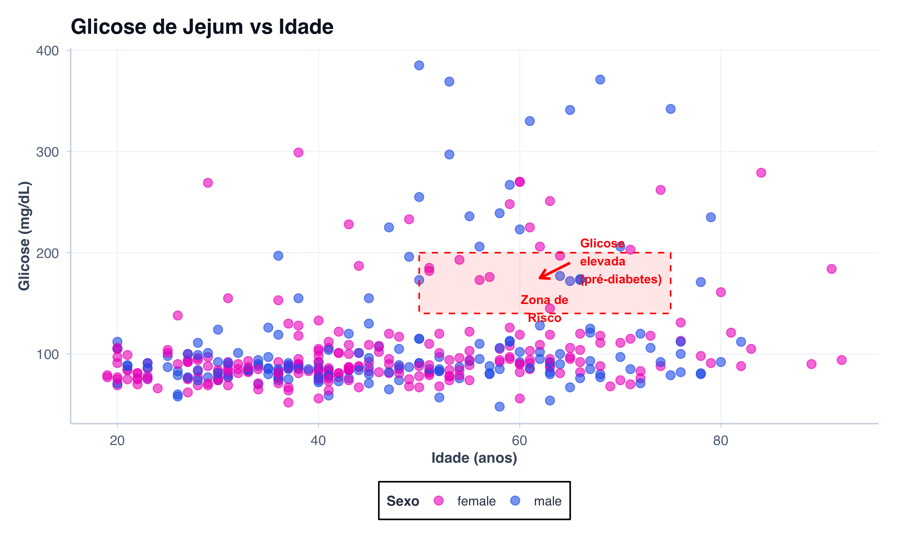 # Gráfico com anotações para destaquepacientes |>ggplot(aes(x = idade, y = glicose, color = sexo)) +geom_point(size =3, alpha =0.6) +scale_color_manual(values = paleta_sexo) +# Anotação: seta indicando valor altoannotate("segment",x =65, xend =62,y =190, yend =175,arrow =arrow(length =unit(0.3, "cm")),color ="red", size =1) +annotate("text",x =66, y =192,label ="Glicose\nelevada\n(pré-diabetes)",color ="red", fontface ="bold",size =3.5, hjust =0) +# Anotação: retângulo destacando zona de riscoannotate("rect",xmin =50, xmax =75,ymin =140, ymax =200,alpha =0.1, fill ="red",color ="red", linetype ="dashed") +annotate("text",x =62.5, y =145,label ="Zona de\nRisco",color ="red", fontface ="bold",size =3.5, hjust =0.5) +labs(title ="Glicose de Jejum vs Idade",x ="Idade (anos)",y ="Glicose (mg/dL)",color ="Sexo" ) +tema_graficos()