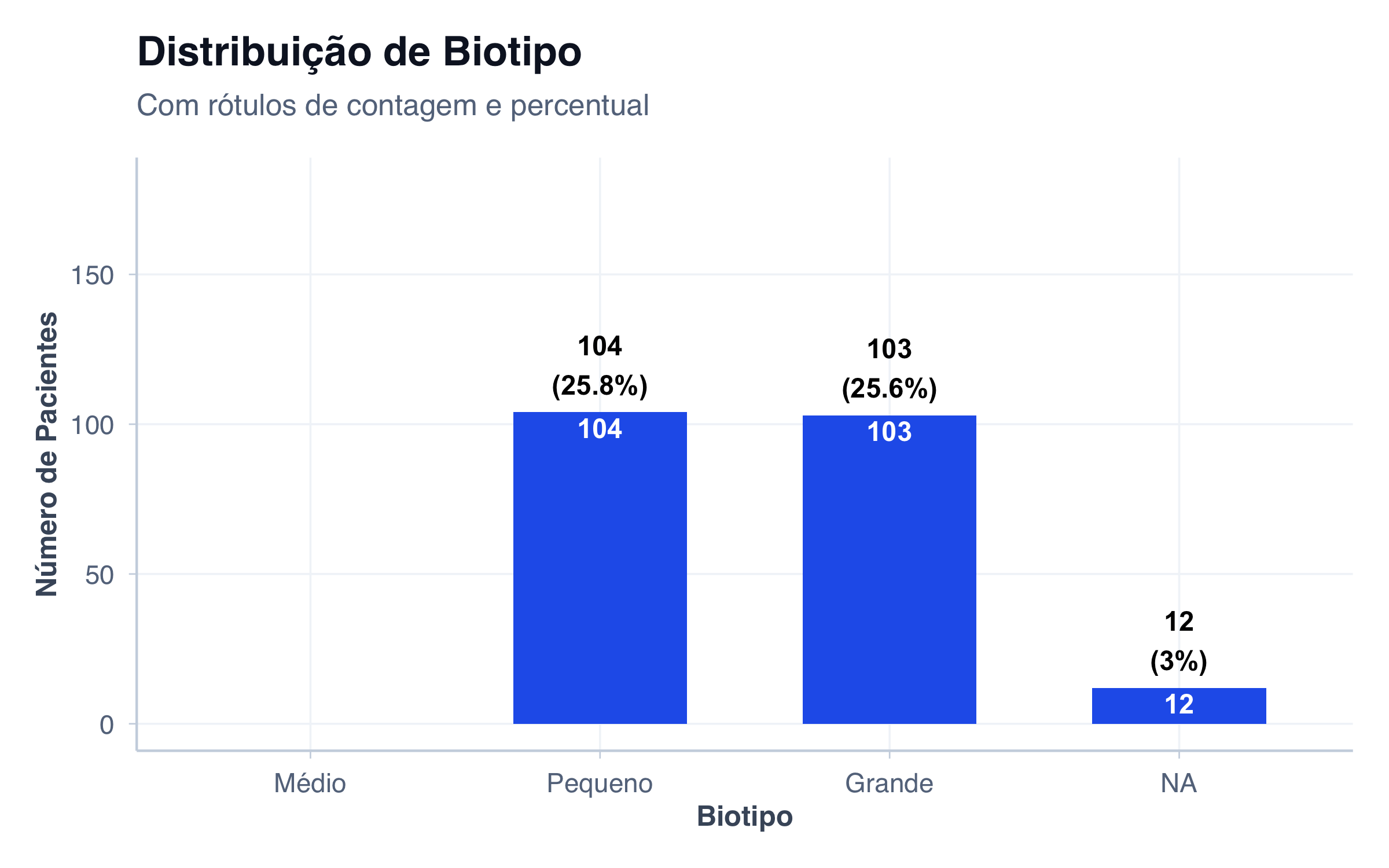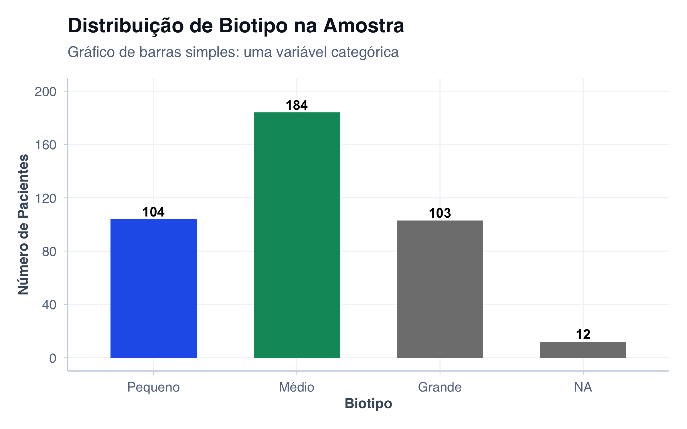 # Contar frequências de biotipodados_biotipo <- pacientes |>count(biotipo) |>mutate(biotipo_label =factor( biotipo,levels =c("small", "medium", "large"),labels =c("Pequeno", "Médio", "Grande") )) |>arrange(desc(n))# Gráfico de barras simplesggplot(dados_biotipo, aes(x = biotipo_label, y = n, fill = biotipo)) +geom_col(width =0.6, show.legend =FALSE) +geom_text(aes(label = n),vjust =-0.3,fontface ="bold",size =4 ) +scale_y_continuous(limits =c(0, 200), breaks =seq(0, 200, 40)) +scale_fill_manual(values =c("small"= cores$azul,"medium"= cores$verde,"large"= cores$laranja )) +labs(title ="Distribuição de Biotipo na Amostra",subtitle ="Gráfico de barras simples: uma variável categórica",x ="Biotipo",y ="Número de Pacientes" ) +tema_graficos()