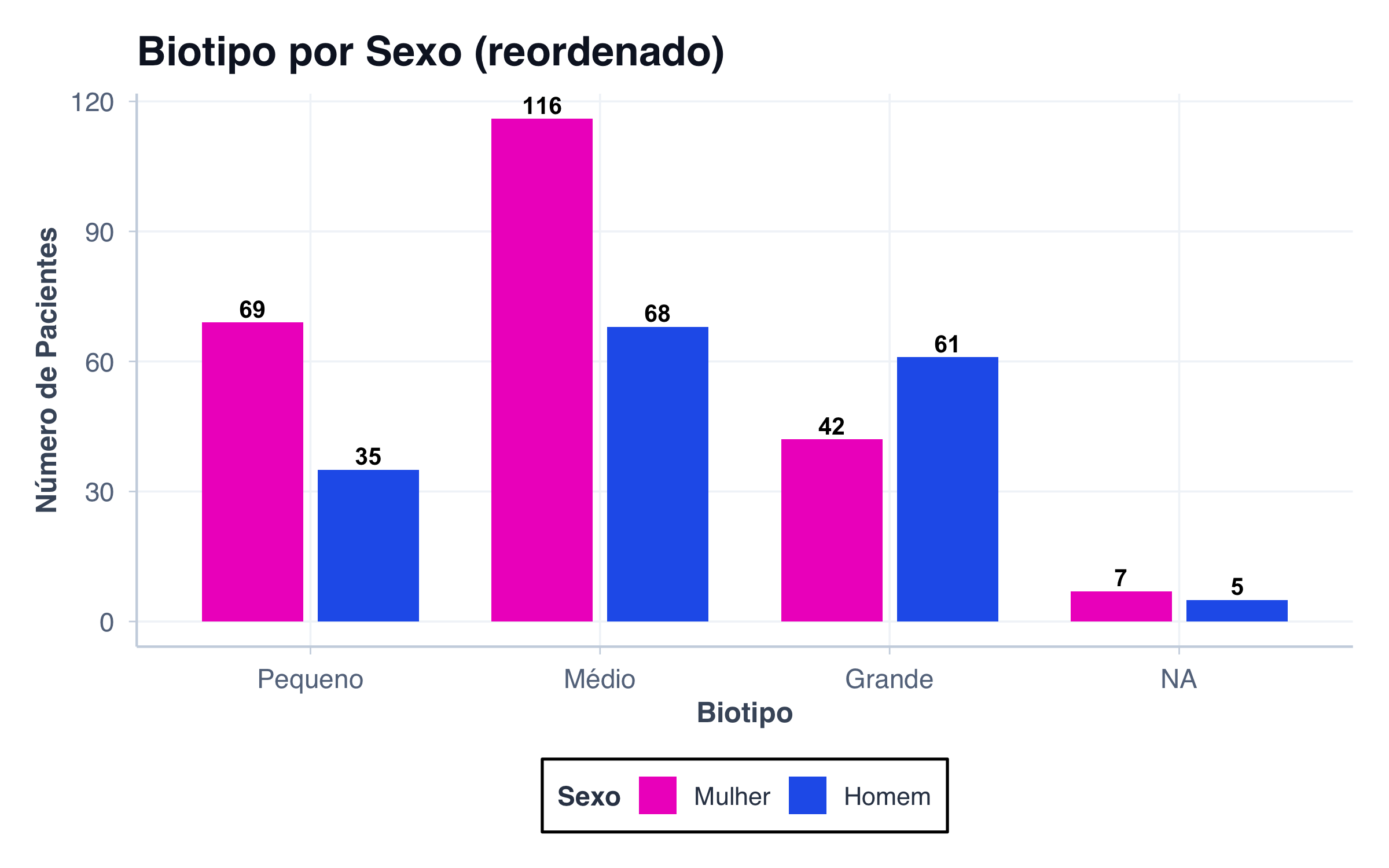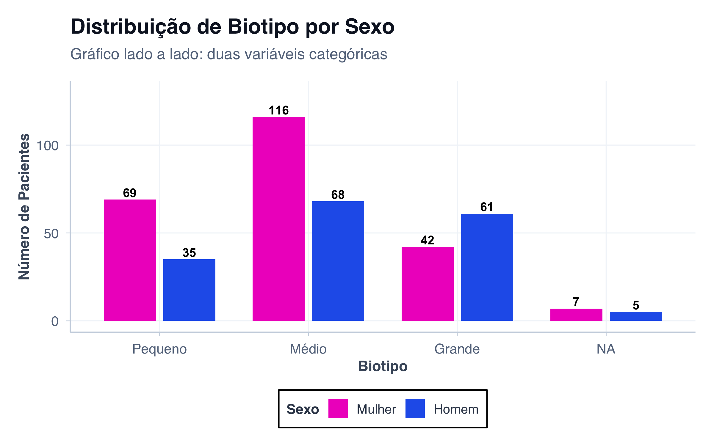 # Biotipo separado por sexodados_biotipo_sexo <- pacientes |>count(biotipo, sexo) |>mutate(biotipo_label =factor( biotipo,levels =c("small", "medium", "large"),labels =c("Pequeno", "Médio", "Grande") ),sexo_label =ifelse(sexo =="female", "Mulher", "Homem") )# Gráfico lado a ladoggplot(dados_biotipo_sexo, aes(x = biotipo_label, y = n, fill = sexo)) +geom_col(position =position_dodge(width =0.8), width =0.7) +geom_text(aes(label = n),position =position_dodge(width =0.8),vjust =-0.3,fontface ="bold",size =3.5 ) +scale_fill_manual(values = paleta_sexo,labels =c("female"="Mulher", "male"="Homem") ) +scale_y_continuous(limits =c(0, 130)) +labs(title ="Distribuição de Biotipo por Sexo",subtitle ="Gráfico lado a lado: duas variáveis categóricas",x ="Biotipo",y ="Número de Pacientes",fill ="Sexo" ) +tema_graficos()