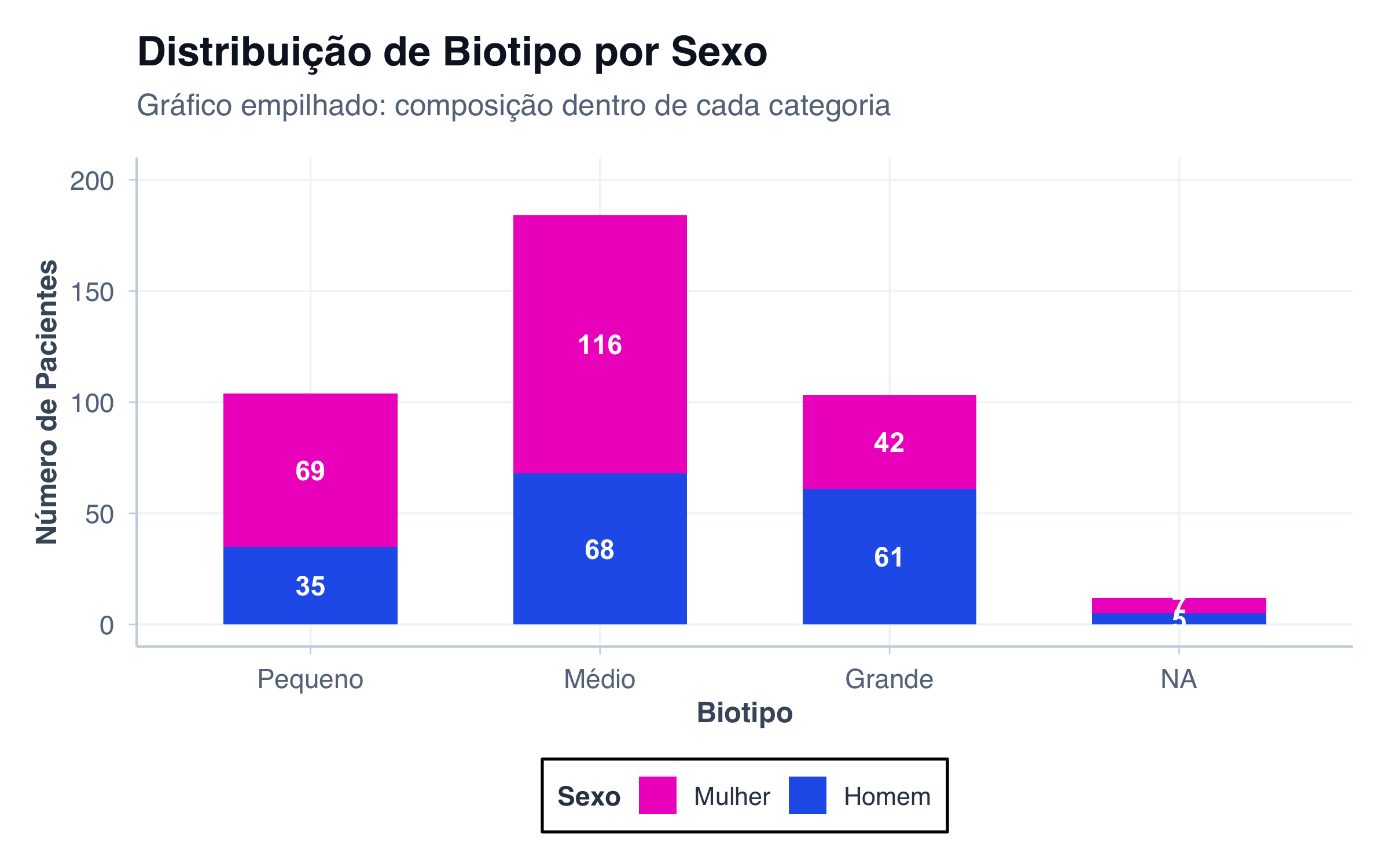 # Biotipo separado por sexodados_biotipo_sexo <- pacientes |>count(biotipo, sexo) |>mutate(biotipo_label =factor( biotipo,levels =c("small", "medium", "large"),labels =c("Pequeno", "Médio", "Grande") ),sexo_label =ifelse(sexo =="female", "Mulher", "Homem") )# Gráfico empilhadoggplot(dados_biotipo_sexo, aes(x = biotipo_label, y = n, fill = sexo)) +geom_col(width =0.6) +geom_text(aes(label = n),position =position_stack(vjust =0.5),fontface ="bold",size =4,color ="white" ) +scale_fill_manual(values = paleta_sexo,labels =c("female"="Mulher", "male"="Homem") ) +scale_y_continuous(limits =c(0, 200)) +labs(title ="Distribuição de Biotipo por Sexo",subtitle ="Gráfico empilhado: composição dentro de cada categoria",x ="Biotipo",y ="Número de Pacientes",fill ="Sexo" ) +tema_graficos()