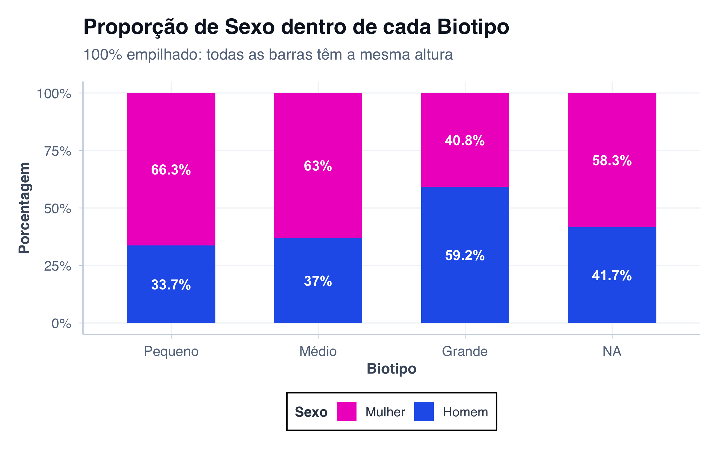 # Biotipo separado por sexo com percentuaisdados_biotipo_sexo_pct <- pacientes |>count(biotipo, sexo) |>group_by(biotipo) |>mutate(pct = n /sum(n) *100,biotipo_label =factor( biotipo,levels =c("small", "medium", "large"),labels =c("Pequeno", "Médio", "Grande") ),sexo_label =ifelse(sexo =="female", "Mulher", "Homem") ) |>ungroup()# Gráfico percentualggplot(dados_biotipo_sexo_pct, aes(x = biotipo_label, y = pct, fill = sexo)) +geom_col(width =0.6) +geom_text(aes(label =paste0(round(pct, 1), "%")),position =position_stack(vjust =0.5),fontface ="bold",size =4,color ="white" ) +scale_fill_manual(values = paleta_sexo,labels =c("female"="Mulher", "male"="Homem") ) +scale_y_continuous(limits =c(0, 100), labels =function(x) paste0(x, "%")) +labs(title ="Proporção de Sexo dentro de cada Biotipo",subtitle ="100% empilhado: todas as barras têm a mesma altura",x ="Biotipo",y ="Porcentagem",fill ="Sexo" ) +tema_graficos()
