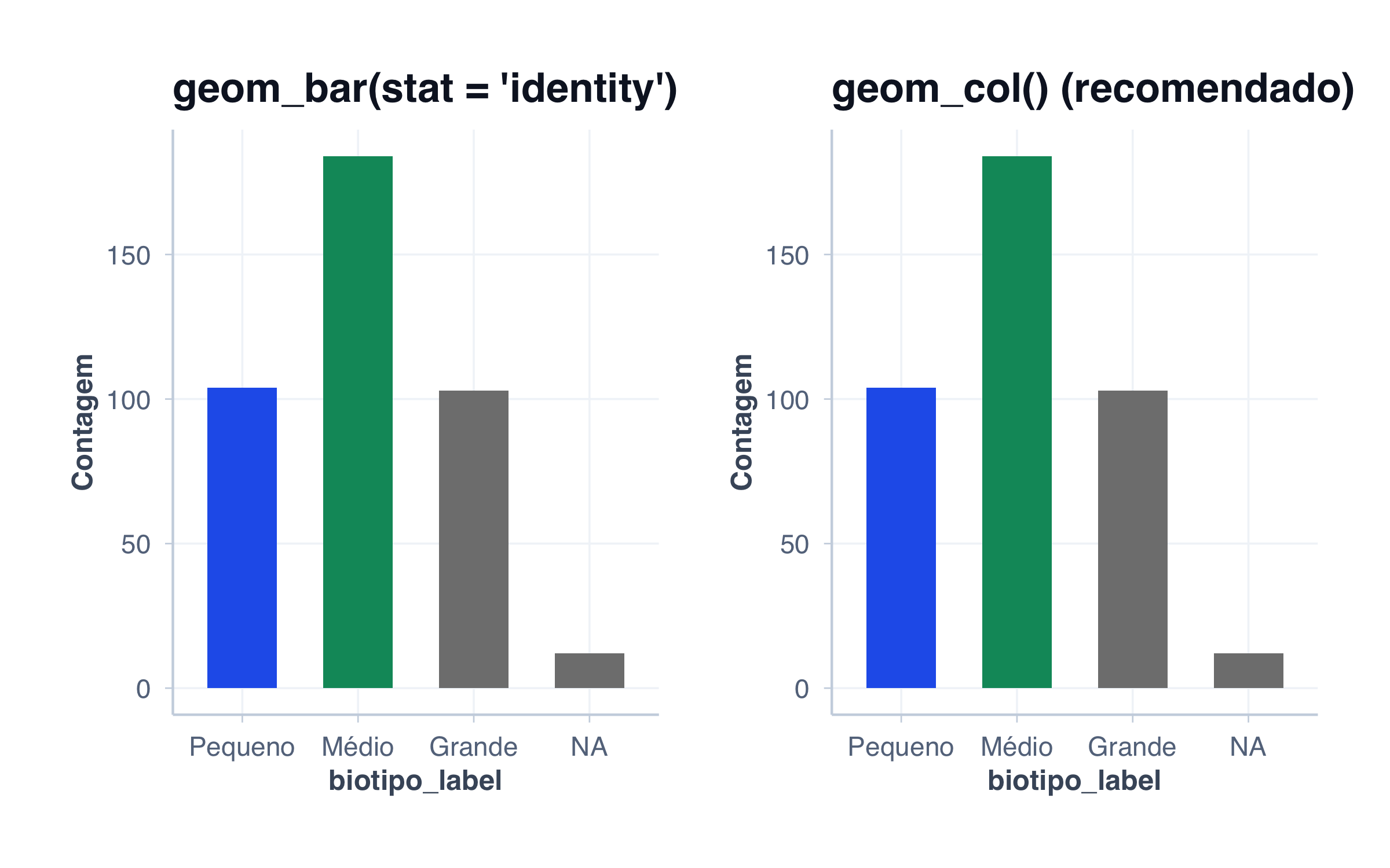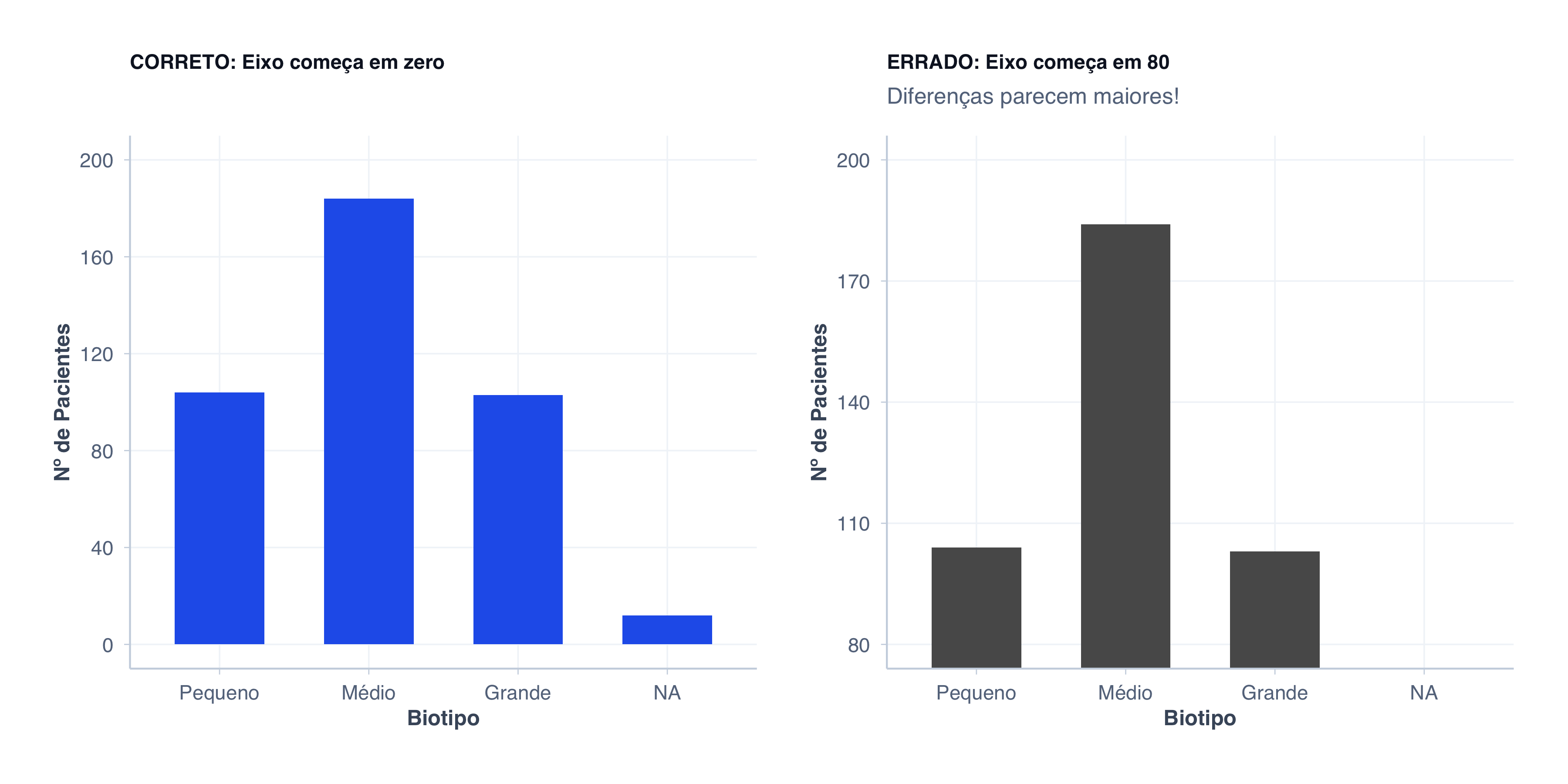 # CORRETO: Eixo começa em zerodados_biotipo <- pacientes |>count(biotipo) |>mutate(biotipo_label =factor( biotipo,levels =c("small", "medium", "large"),labels =c("Pequeno", "Médio", "Grande") )) |>arrange(desc(n))p_correto <-ggplot(dados_biotipo, aes(x = biotipo_label, y = n)) +geom_col(fill = cores$azul, width =0.6) +scale_y_continuous(limits =c(0, 200), breaks =seq(0, 200, 40)) +labs(title ="CORRETO: Eixo começa em zero",x ="Biotipo",y ="Nº de Pacientes" ) +tema_graficos() +theme(plot.title =element_text(size =11))# ERRADO: Eixo começa em 80 (engana o leitor!)p_errado <-ggplot(dados_biotipo, aes(x = biotipo_label, y = n)) +geom_col(fill = cores$laranja, width =0.6) +scale_y_continuous(breaks =seq(80, 200, 30)) +coord_cartesian(ylim =c(80, 200)) +labs(title ="ERRADO: Eixo começa em 80",subtitle ="Diferenças parecem maiores!",x ="Biotipo",y ="Nº de Pacientes" ) +tema_graficos() +theme(plot.title =element_text(size =11))# Comparação lado a ladop_correto + p_errado