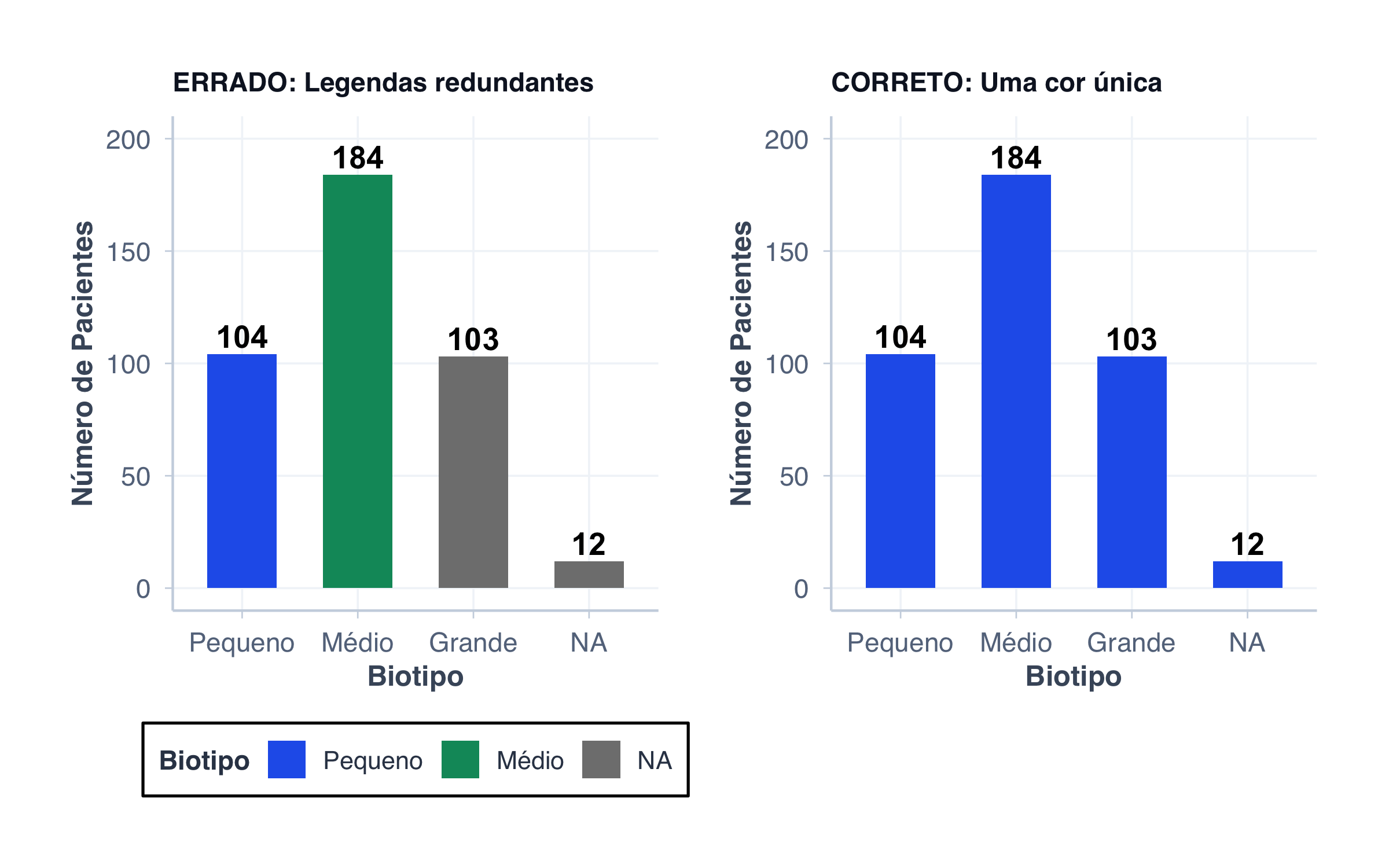 # ERRADO: Cores demaisp_muitas_cores <-ggplot(dados_biotipo, aes(x = biotipo_label, y = n, fill = biotipo_label)) +geom_col(width =0.6) +geom_text(aes(label = n), vjust =-0.3, fontface ="bold") +scale_y_continuous(limits =c(0, 200)) +scale_fill_manual(values =c("Pequeno"= cores$azul,"Médio"= cores$verde,"Grande"= cores$laranja )) +labs(title ="ERRADO: Legendas redundantes",x ="Biotipo",y ="Número de Pacientes",fill ="Biotipo" ) +tema_graficos() +theme(plot.title =element_text(size =11))# CORRETO: Uma cor única para toda a sériep_uma_cor <-ggplot(dados_biotipo, aes(x = biotipo_label, y = n)) +geom_col(fill = cores$azul, width =0.6) +geom_text(aes(label = n), vjust =-0.3, fontface ="bold") +scale_y_continuous(limits =c(0, 200)) +labs(title ="CORRETO: Uma cor única",x ="Biotipo",y ="Número de Pacientes" ) +tema_graficos() +theme(plot.title =element_text(size =11))p_muitas_cores + p_uma_cor