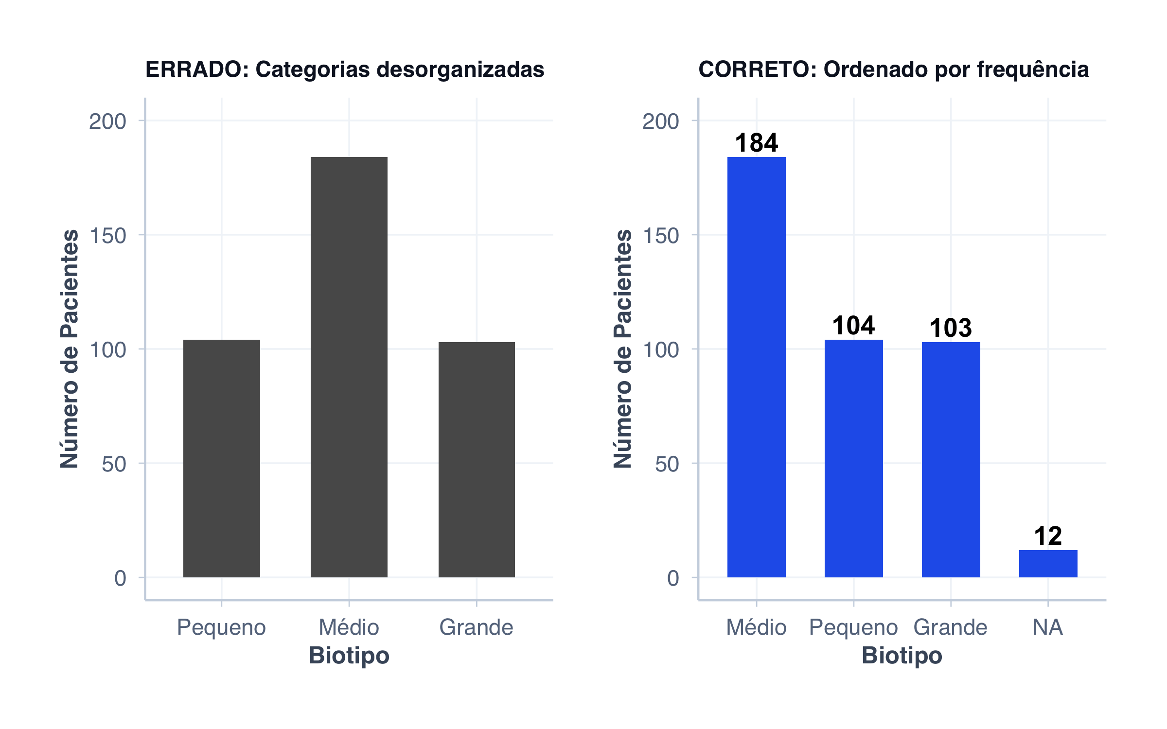 b) Ordem de frequência (maior para menor) Isso torna o gráfico muito mais fácil de interpretar. O leitor pode imediatamente identificar as categorias mais e menos frequentes. A ordem alfabética pode ser apropriada em alguns contextos (como nomes de medicamentos), mas frequência é geralmente preferida para análise exploratória.