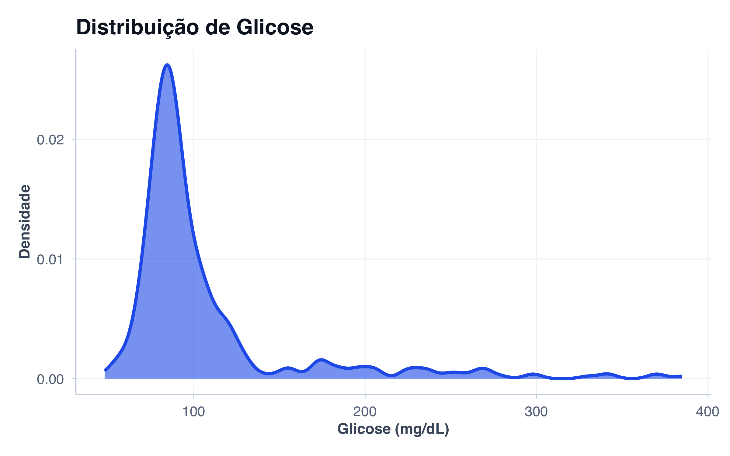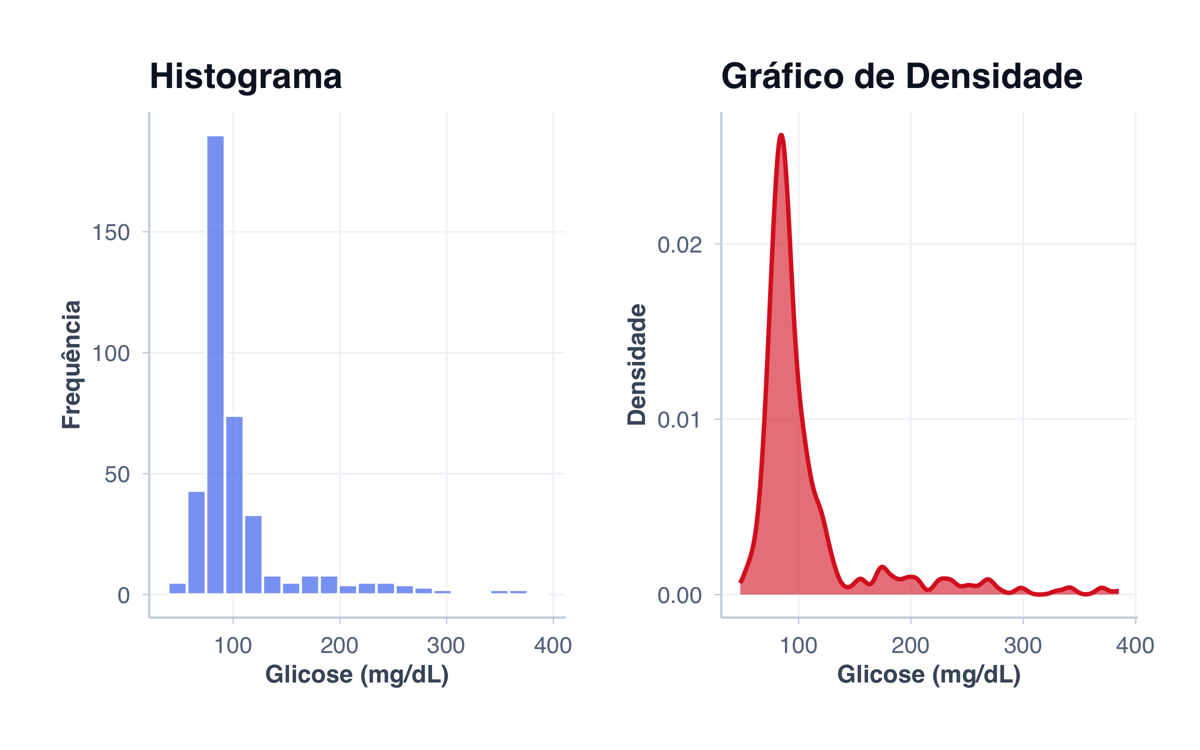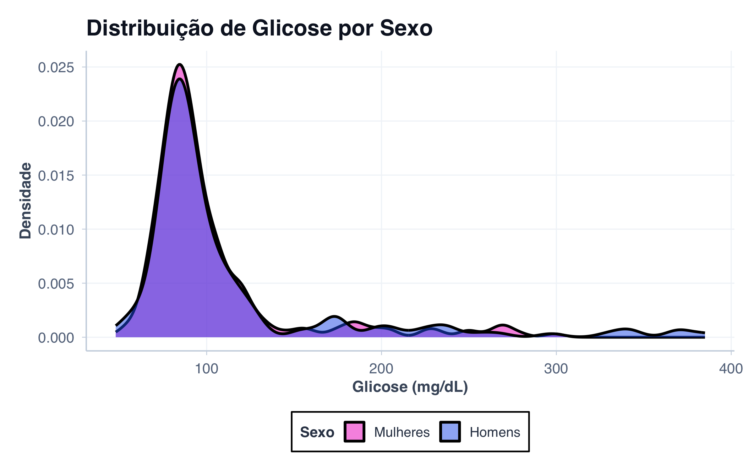 ggplot(pacientes, aes(x = glicose, fill = sexo)) +geom_density(alpha =0.5, linewidth =1) +scale_fill_manual(values = paleta_sexo,labels =c("female"="Mulheres", "male"="Homens") ) +labs(title ="Distribuição de Glicose por Sexo",x ="Glicose (mg/dL)",y ="Densidade",fill ="Sexo" ) +tema_graficos()