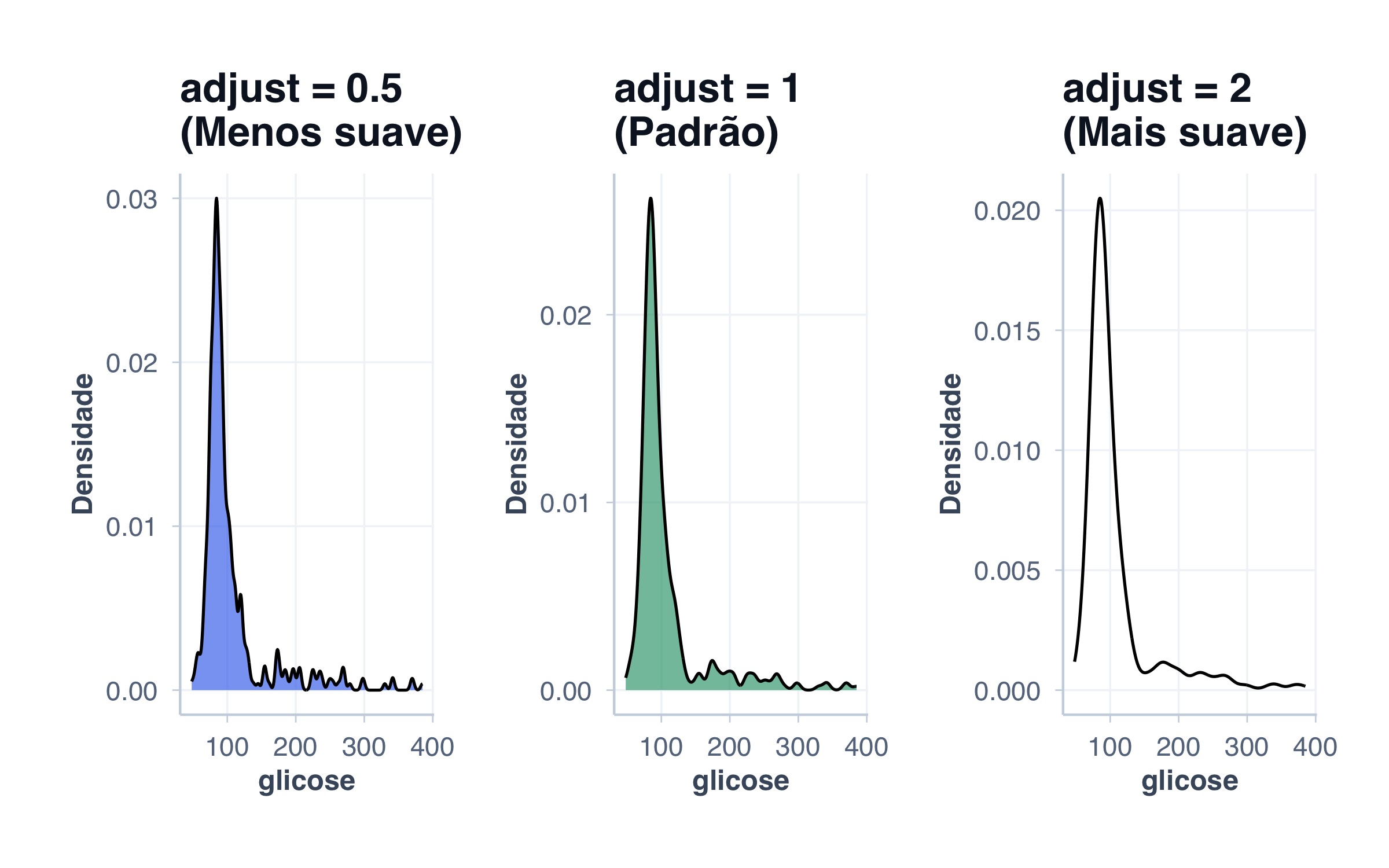 O parâmetro adjust em ggplot2 controla o suavismo. Valores < 1 criam curvas mais “nervosas”; valores > 1 criam curvas mais suavizadas.