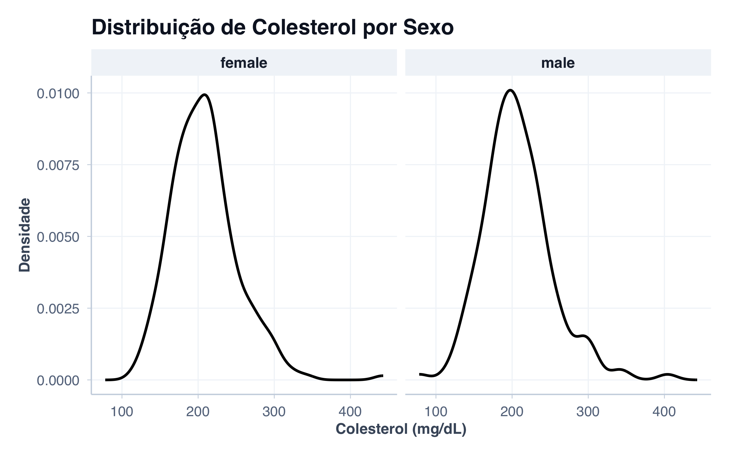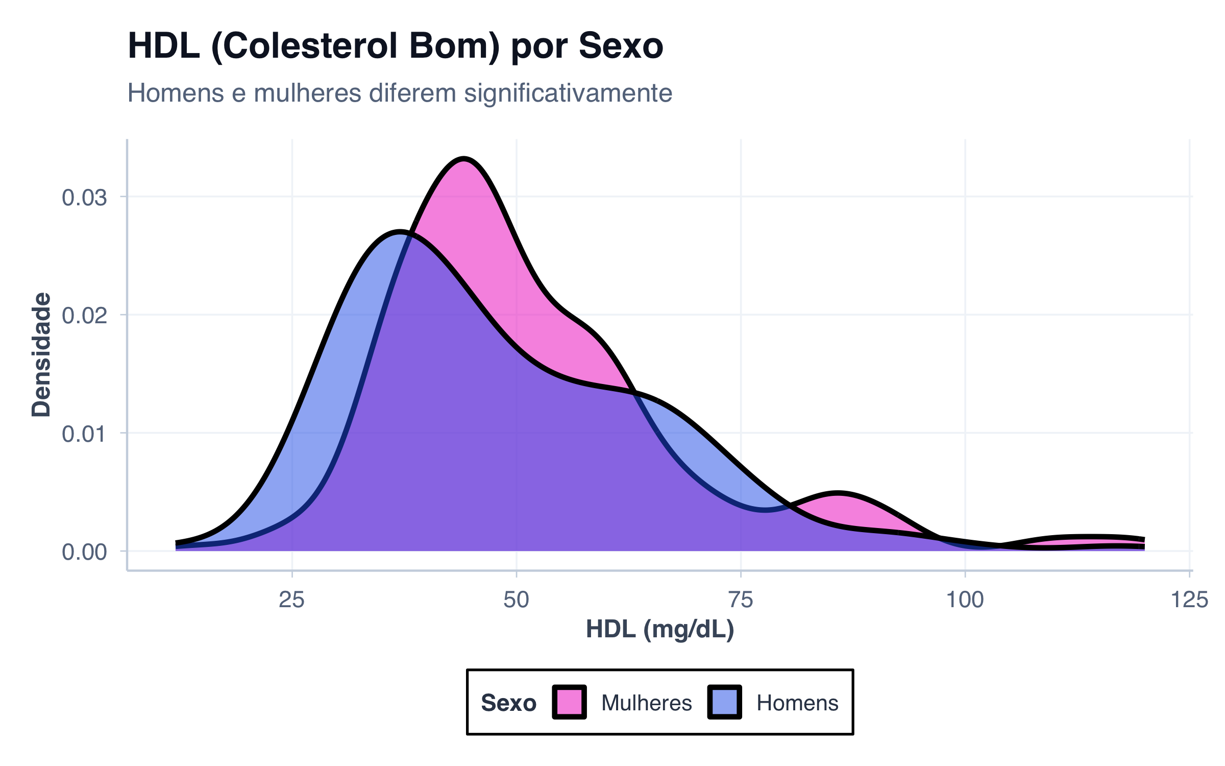 Observe como as duas distribuições se sobrepõem, revelando diferenças sutis entre homens e mulheres.