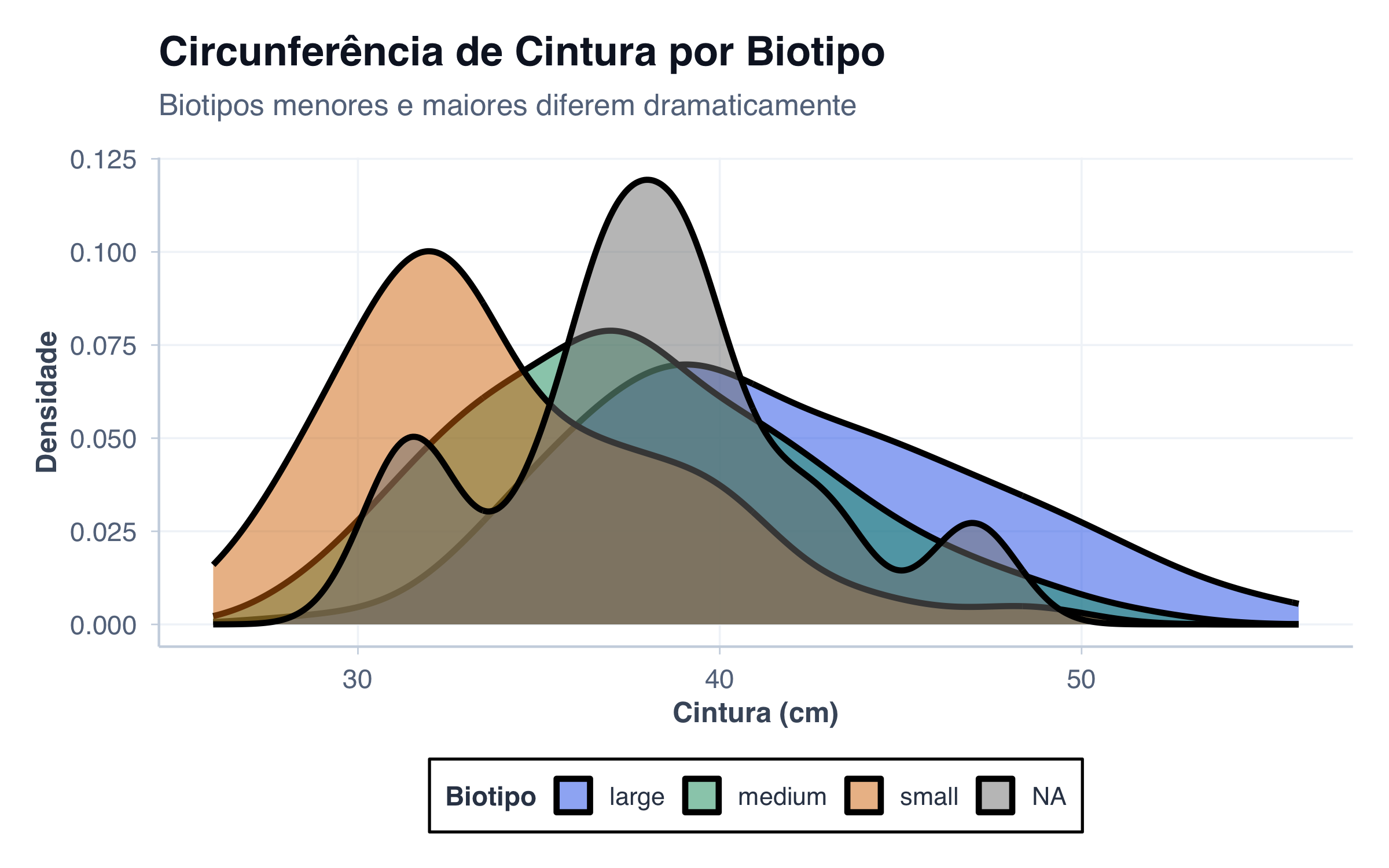 ggplot(pacientes, aes(x = cintura, fill = biotipo)) +geom_density(alpha =0.5, linewidth =1.2) +scale_fill_manual(values = paleta_cat) +labs(title ="Circunferência de Cintura por Biotipo",subtitle ="Biotipos menores e maiores diferem dramaticamente",x ="Cintura (cm)",y ="Densidade",fill ="Biotipo" ) +tema_graficos() +theme(legend.position ="bottom")