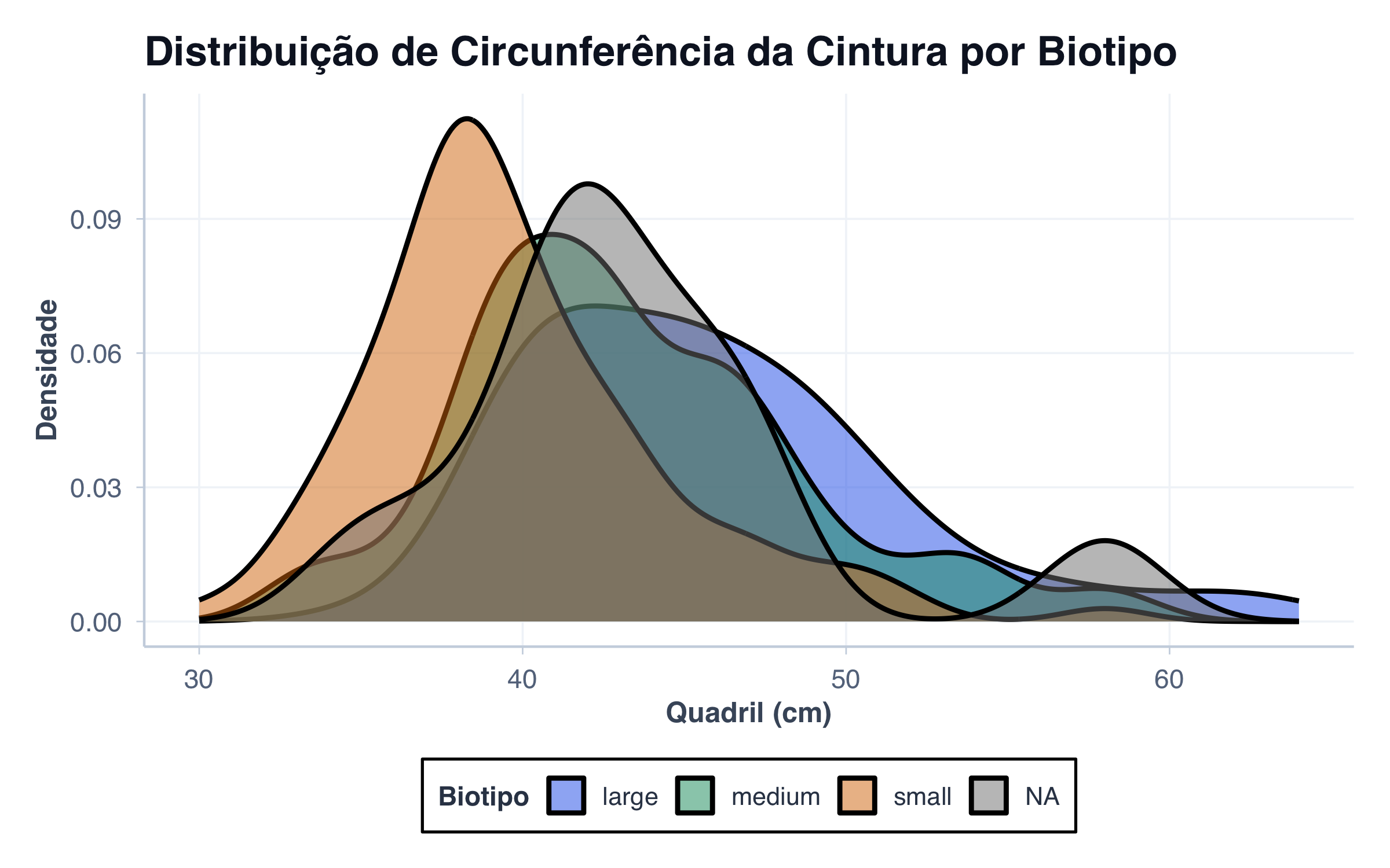 ggplot(pacientes, aes(x = quadril, fill = biotipo)) +geom_density(alpha =0.5, linewidth =1) +scale_fill_manual(values = paleta_cat) +labs(title ="Distribuição de Circunferência da Cintura por Biotipo",x ="Quadril (cm)",y ="Densidade",fill ="Biotipo" ) +tema_graficos() +theme(legend.position ="bottom")