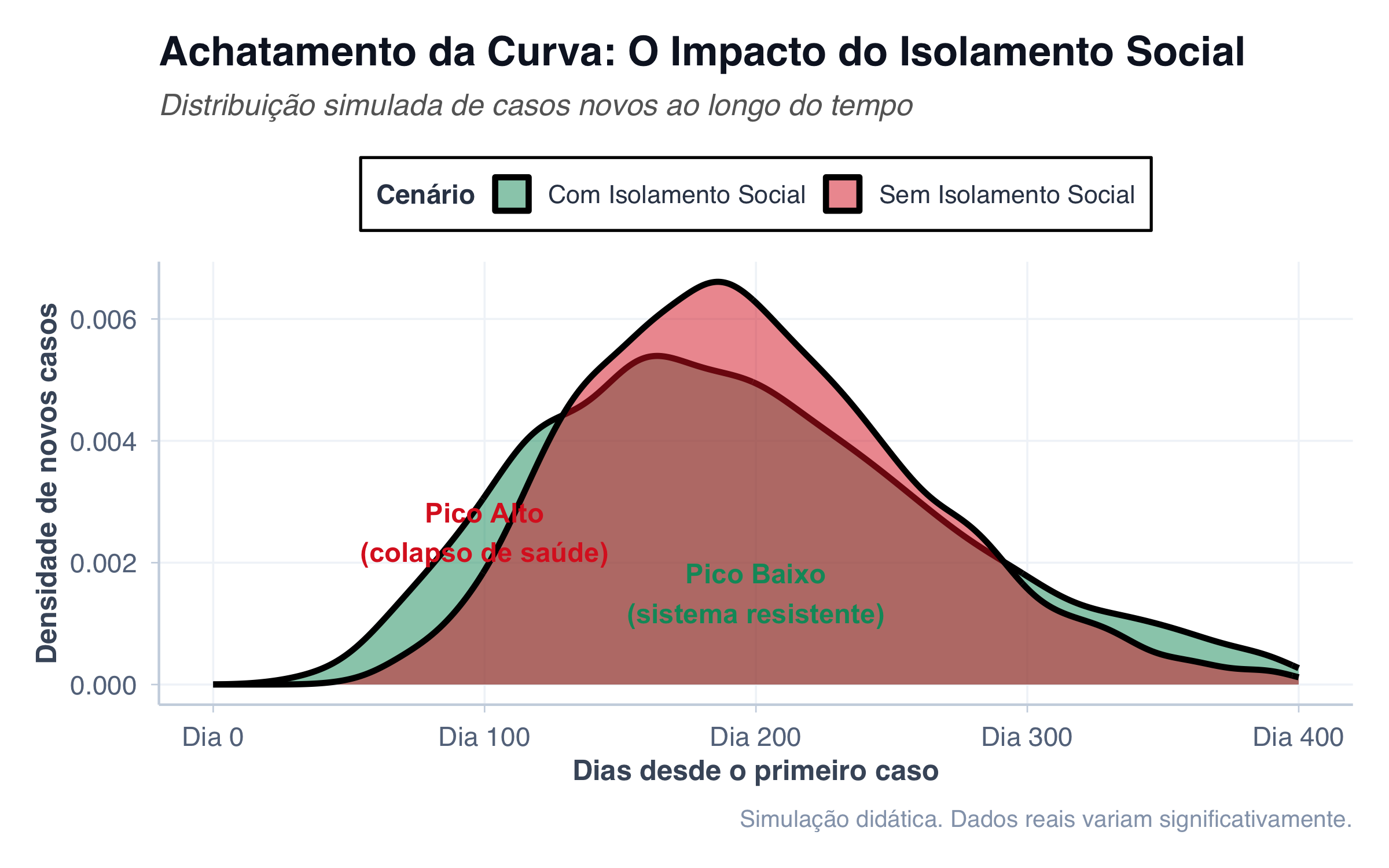 # Simulando dados de duas curvas epidêmicas# Cenário 1: Sem isolamento (pico alto e rápido)# Cenário 2: Com isolamento (pico baixo e distribuído)set.seed(42)# Curva 1: Sem isolamento - distribuição mais concentrada (Gamma)dias_sem_isolamento <-rgamma(5000, shape =10, rate =0.05)dados_sem_isolamento <-data.frame(dia = dias_sem_isolamento,cenario ="Sem Isolamento Social")# Curva 2: Com isolamento - distribuição mais dispersa (Gamma com parâmetros diferentes)dias_com_isolamento <-rgamma(5000, shape =6, rate =0.03)dados_com_isolamento <-data.frame(dia = dias_com_isolamento,cenario ="Com Isolamento Social")dados_epidemia <-rbind(dados_sem_isolamento, dados_com_isolamento)ggplot(dados_epidemia, aes(x = dia, fill = cenario)) +geom_density(alpha =0.5, linewidth =1.2) +scale_fill_manual(values =c("Sem Isolamento Social"= cores$vermelho,"Com Isolamento Social"= cores$verde ) ) +scale_x_continuous(limits =c(0, 400),labels =function(x) paste0("Dia ", x) ) +labs(title ="Achatamento da Curva: O Impacto do Isolamento Social",subtitle ="Distribuição simulada de casos novos ao longo do tempo",x ="Dias desde o primeiro caso",y ="Densidade de novos casos",fill ="Cenário",caption ="Simulação didática. Dados reais variam significativamente." ) +tema_graficos() +theme(legend.position ="top",plot.subtitle =element_text(face ="italic", color ="gray40") ) +annotate("text",x =100, y =0.0025,label ="Pico Alto\n(colapso de saúde)",color = cores$vermelho,fontface ="bold",size =4 ) +annotate("text",x =200, y =0.0015,label ="Pico Baixo\n(sistema resistente)",color = cores$verde,fontface ="bold",size =4 )