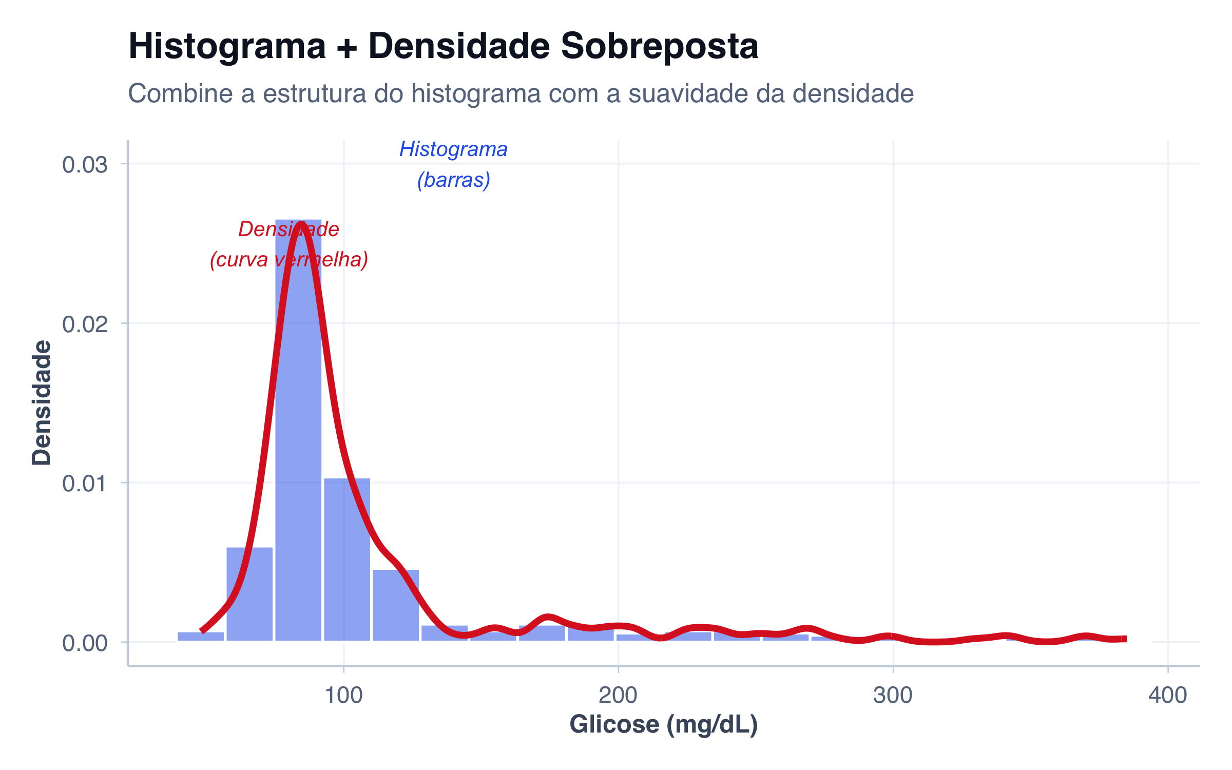 A chave é usar aes(y = after_stat(density)) no histograma para que as alturas das barras representem densidade, não contagem, permitindo comparação direta com a curva de densidade.