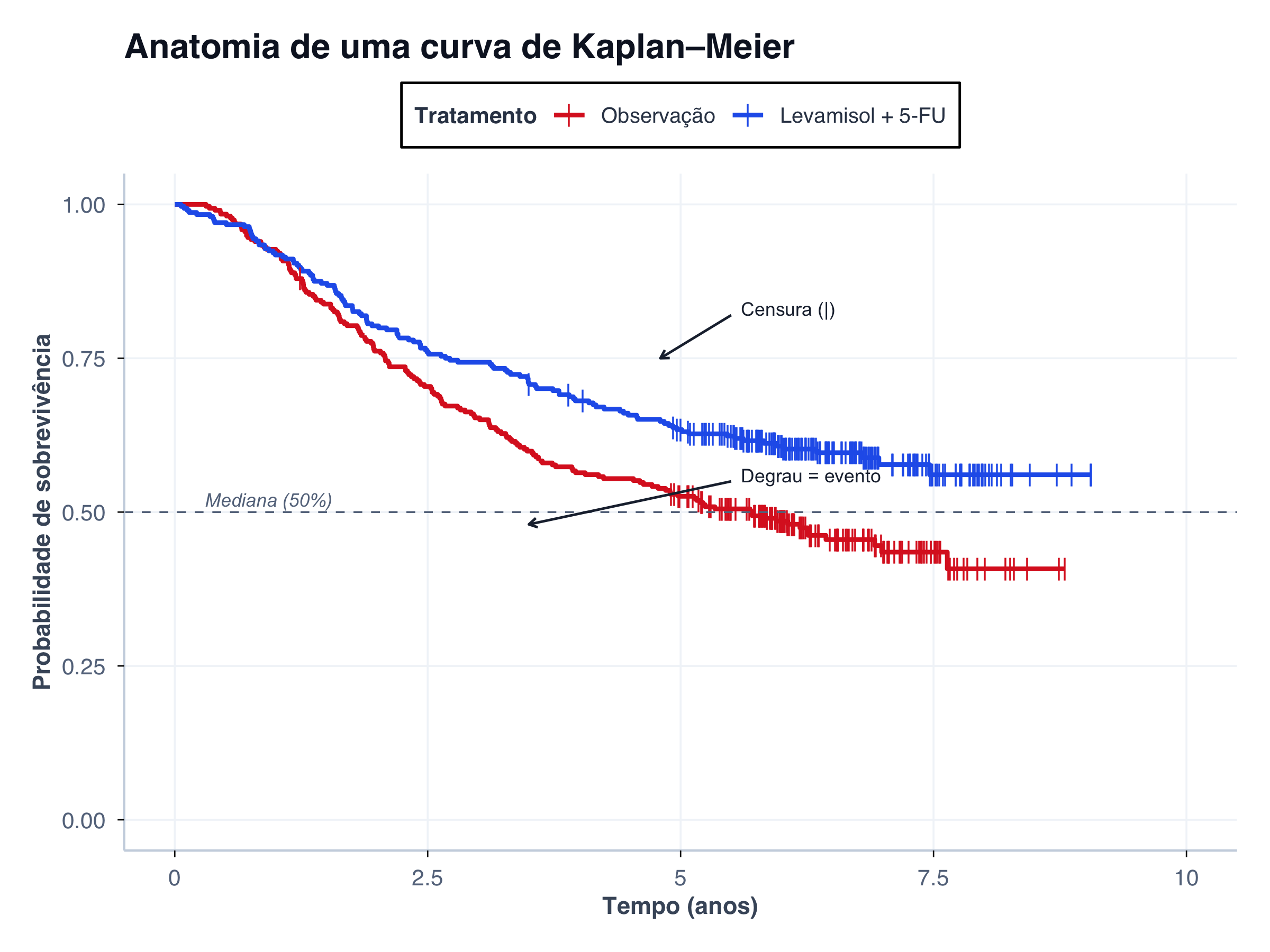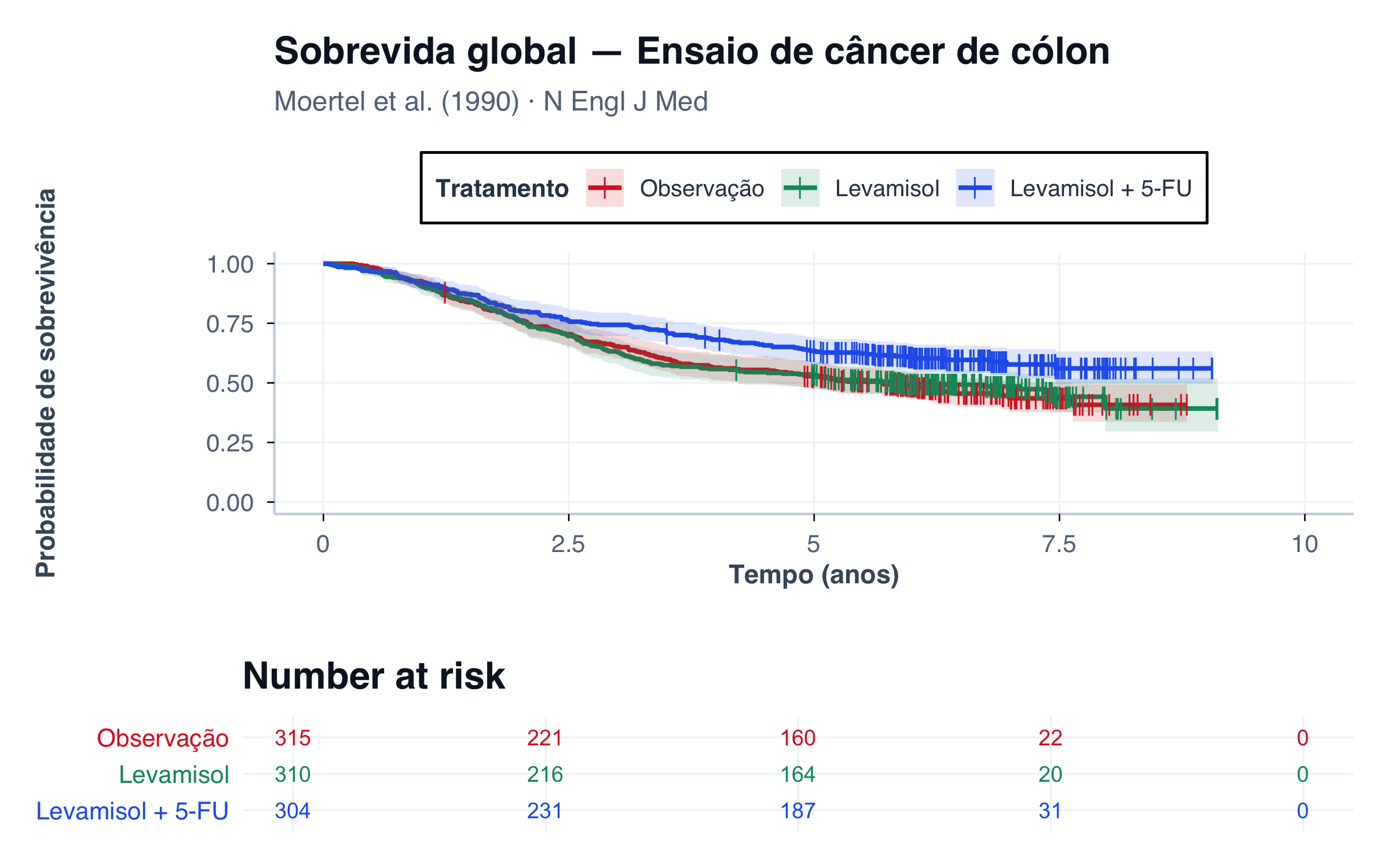 Vamos usar dados reais de um dos ensaios clínicos mais importantes da oncologia: o estudo de Moertel et al. (1990), publicado no New England Journal of Medicine(Moertel et al., 1990). Esse estudo demonstrou, pela primeira vez, que a quimioterapia adjuvante com levamisol e fluorouracil reduzia a recorrência e a mortalidade em pacientes com câncer de cólon ressecado.