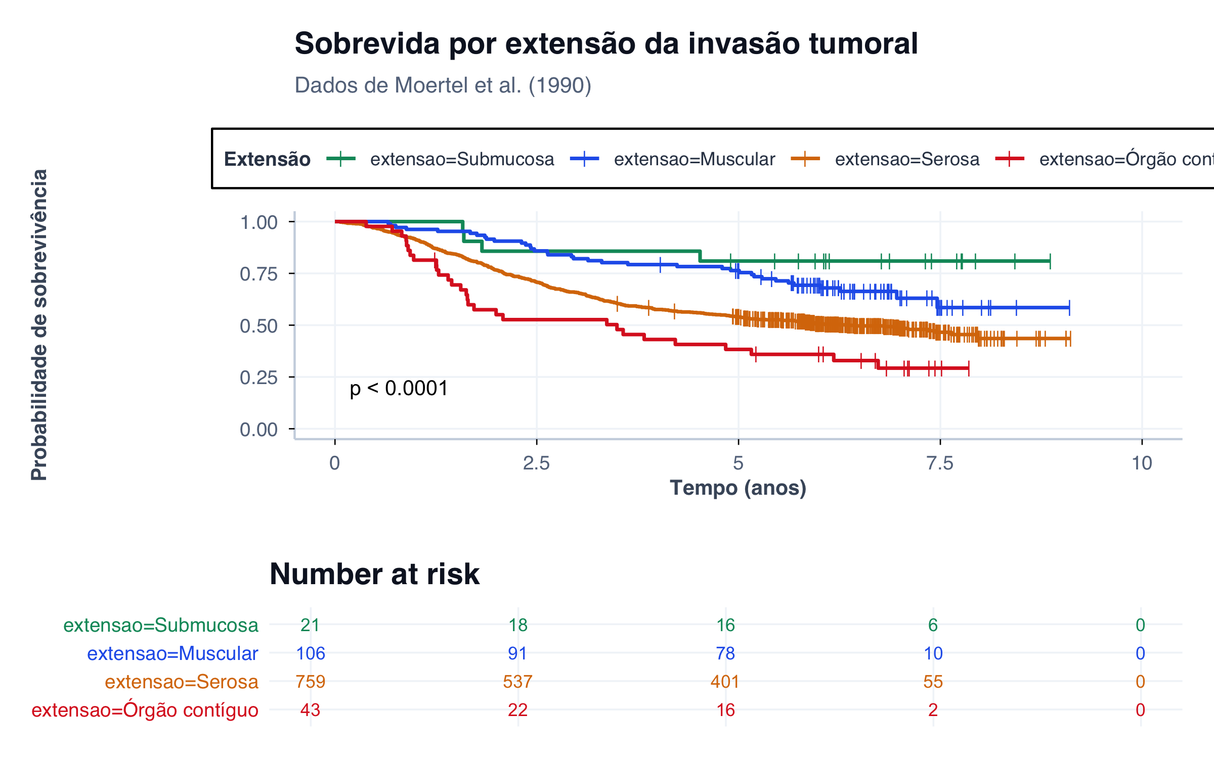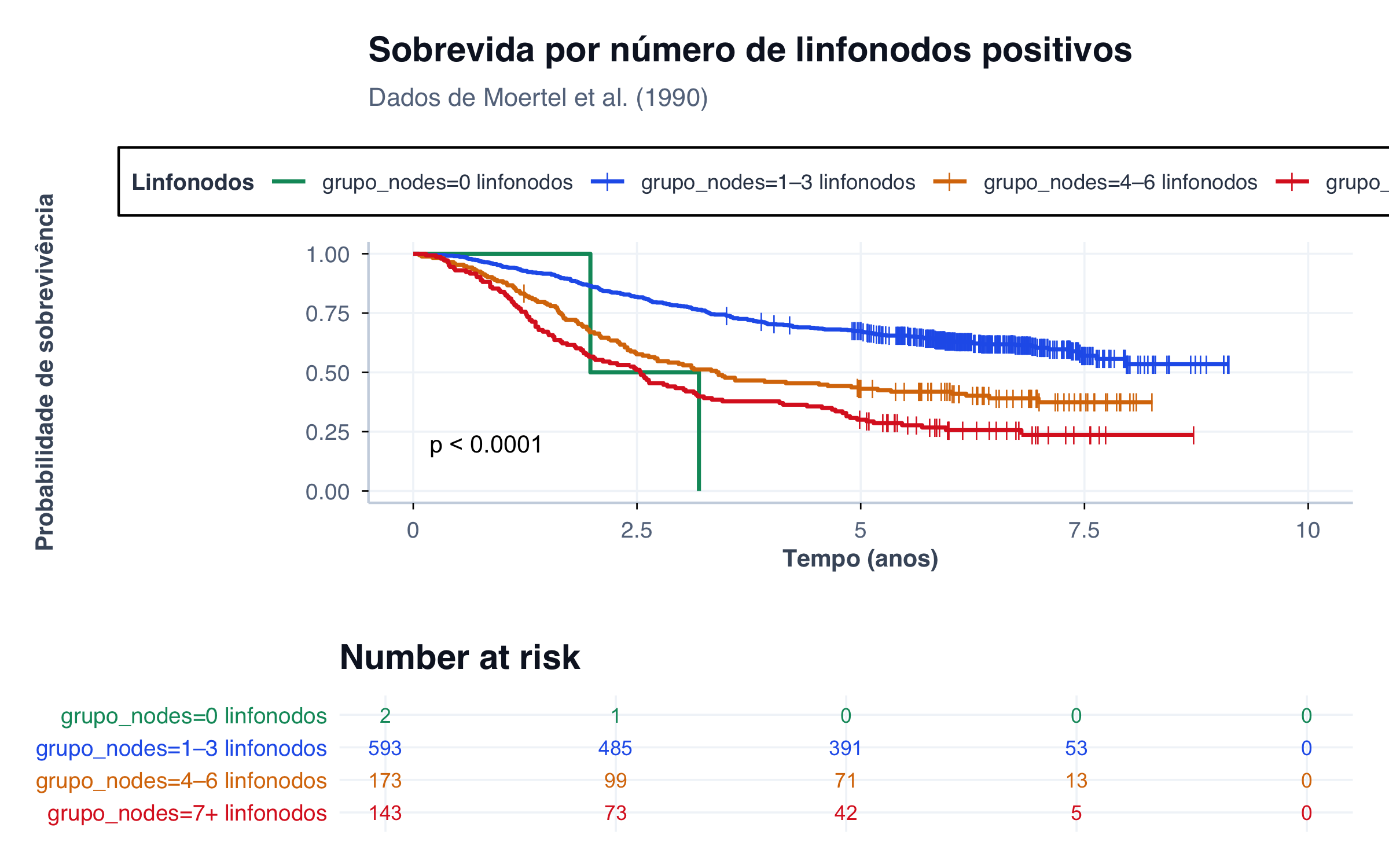 A tabela de risco (number at risk) abaixo do gráfico mostra quantos pacientes ainda estão em acompanhamento em cada momento. Essa informação é essencial: à medida que o tempo passa, o número de pacientes em risco diminui, e as estimativas se tornam menos precisas.