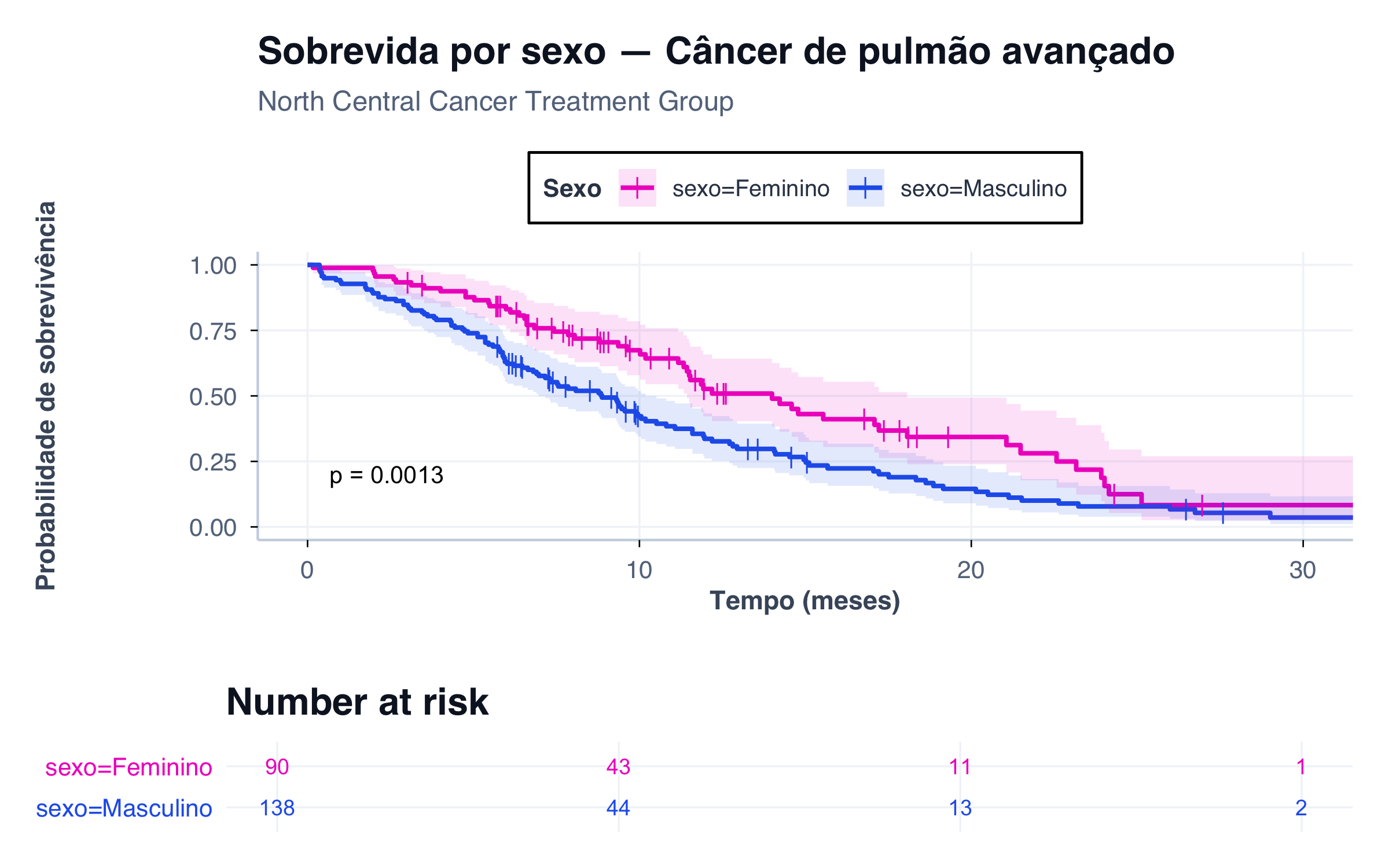 # Preparar dadosdados_lung <- survival::lung |>mutate(sexo =ifelse(sex ==1, "Masculino", "Feminino"),tempo_meses = time /30.44# converter dias para meses )fit_lung <-survfit(Surv(tempo_meses, status) ~ sexo, data = dados_lung)ggsurvplot( fit_lung,data = dados_lung,palette =c("#ef24c6", "#2563EB"), # Feminino (rosa), Masculino (azul)size =0.9,censor.shape ="|",censor.size =3,conf.int =TRUE,conf.int.alpha =0.12,risk.table =TRUE,risk.table.height =0.25,risk.table.fontsize =3.2,risk.table.col ="strata",xlab ="Tempo (meses)",ylab ="Probabilidade de sobrevivência",title ="Sobrevida por sexo — Câncer de pulmão avançado",subtitle ="North Central Cancer Treatment Group",legend.title ="Sexo",pval =TRUE,pval.size =3.5,ggtheme =tema_graficos(base_size =12),tables.theme =theme_cleantable())