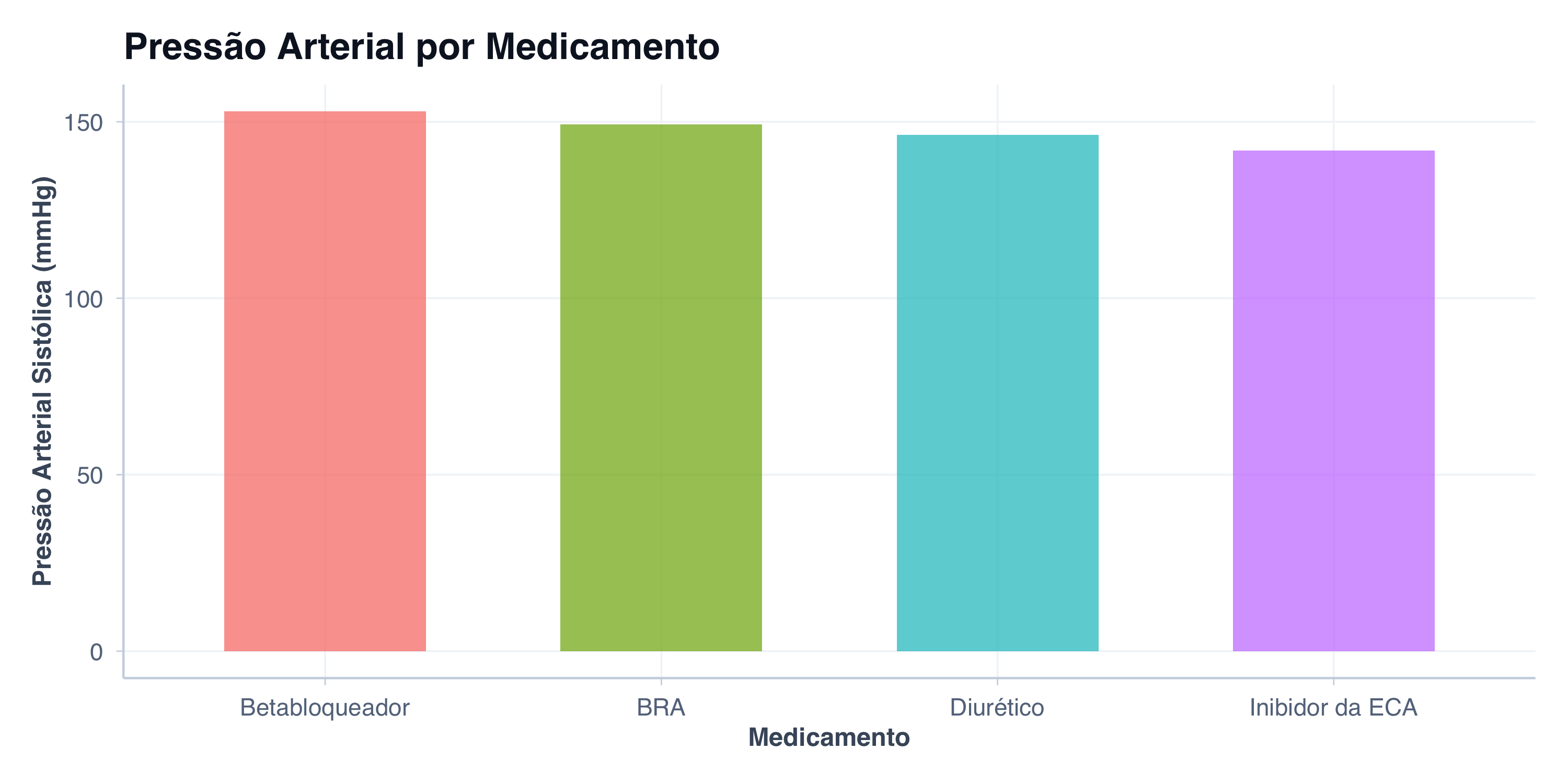 # Resultado provável de um prompt vagoggplot(hipertensos, aes(x = medicamento, y = pas, fill = medicamento)) +geom_bar(stat ="summary", fun = mean, alpha =0.7, width =0.6) +tema_graficos() +labs(title ="Pressão Arterial por Medicamento",x ="Medicamento",y ="Pressão Arterial Sistólica (mmHg)" ) +theme(legend.position ="none")