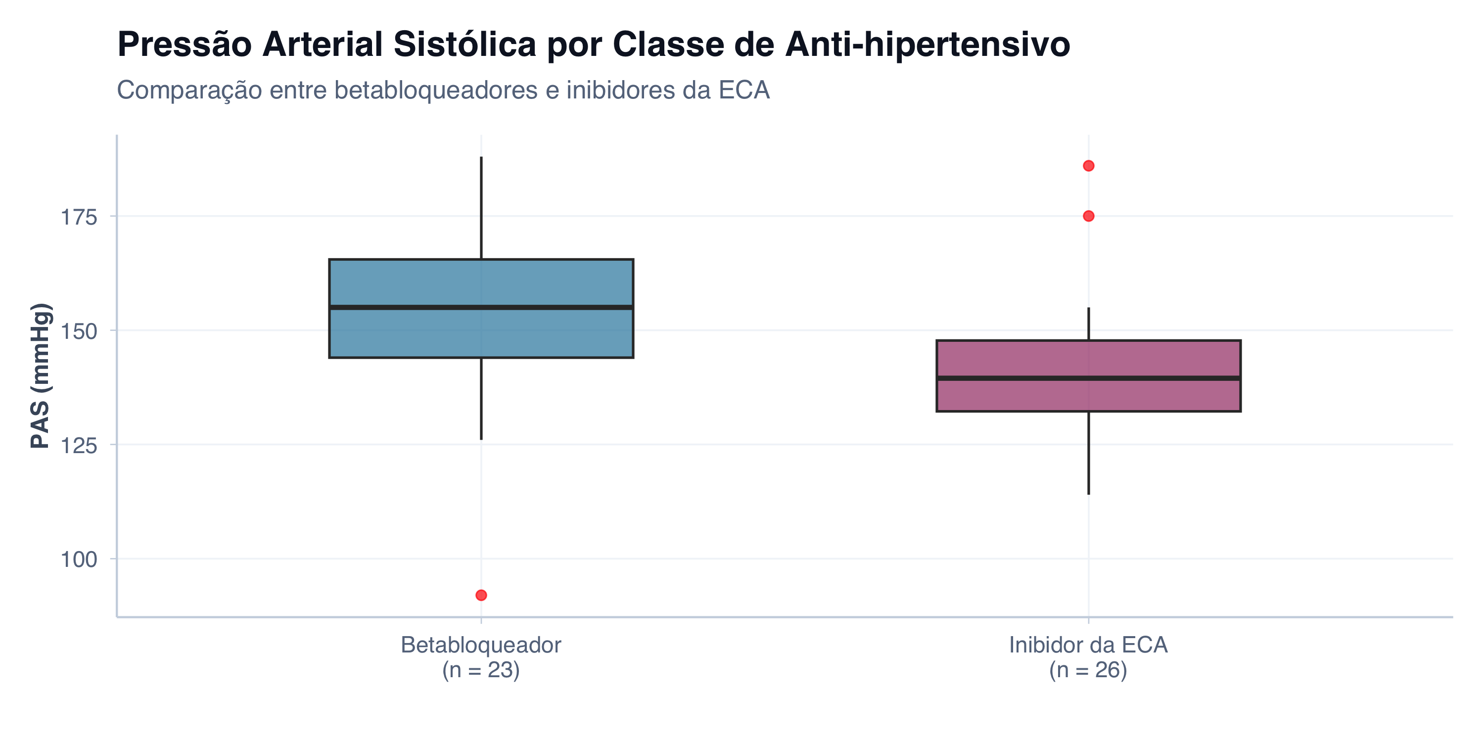 # Resultado de um prompt precisohipertensos_filtrado <- hipertensos |>filter(medicamento %in%c("Betabloqueador", "Inibidor da ECA"))# Calcular n por grupo para rótulos do eixo Xn_por_grupo <- hipertensos_filtrado |>count(medicamento) |>mutate(label =paste0(medicamento, "\n(n = ", n, ")"))rotulos <-setNames(n_por_grupo$label, n_por_grupo$medicamento)ggplot(hipertensos_filtrado, aes(x = medicamento, y = pas, fill = medicamento)) +geom_boxplot(alpha =0.7, width =0.5, outlier.color ="red", outlier.size =2) +scale_x_discrete(labels = rotulos) +scale_fill_manual(values =c("Betabloqueador"="#2E86AB", "Inibidor da ECA"="#A23B72")) +tema_graficos() +labs(title ="Pressão Arterial Sistólica por Classe de Anti-hipertensivo",subtitle ="Comparação entre betabloqueadores e inibidores da ECA",x ="",y ="PAS (mmHg)" ) +theme(legend.position ="none")