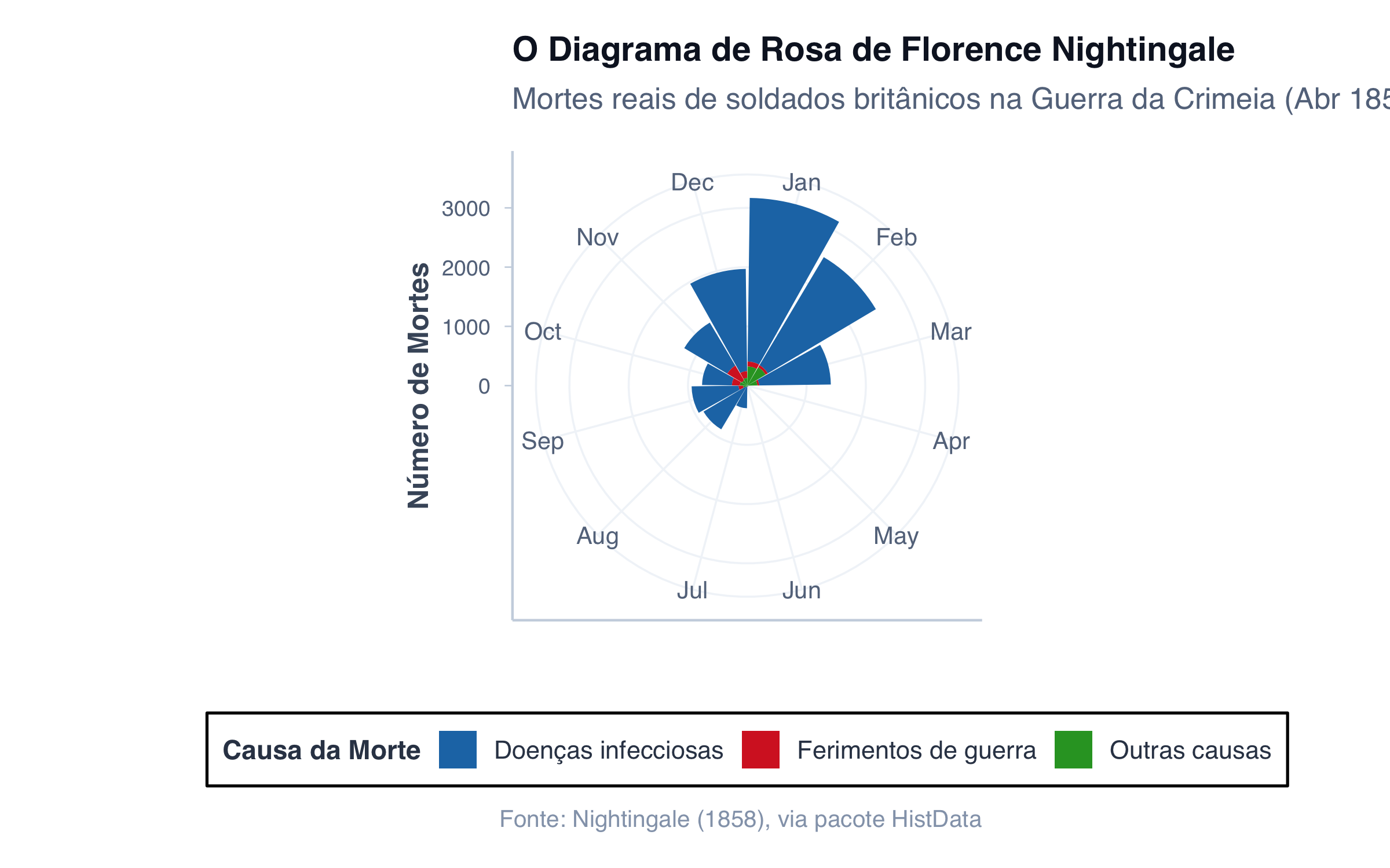 # Dados históricos reais de Florence Nightingale# Fonte: pacote HistData (Friendly, 2021), compilados a partir de# Nightingale, F. (1858). Notes on Matters Affecting the Health,# Efficiency and Hospital Administration of the British Army.library(HistData)data(Nightingale)# Selecionar o primeiro período: Abril 1854 a Março 1855# (corresponde ao diagrama direito do original de Nightingale)dados_nightingale <- Nightingale[1:12, ] %>%select(Month, Disease, Wounds, Other) %>%pivot_longer(cols =c(Disease, Wounds, Other),names_to ="causa",values_to ="mortes" ) %>%mutate(causa =case_match( causa,"Disease"~"Doenças infecciosas","Wounds"~"Ferimentos de guerra","Other"~"Outras causas" ),Month =factor(Month, levels =c("Apr", "May", "Jun", "Jul", "Aug", "Sep","Oct", "Nov", "Dec", "Jan", "Feb", "Mar" )) )# Cores historicamente apropriadas# (Nightingale usou azul para doenças, vermelho para ferimentos,# preto para outras causas)cores_causas <-c("Doenças infecciosas"="#1f77b4", # Azul"Ferimentos de guerra"="#d62728", # Vermelho"Outras causas"="#2ca02c"# Verde)# Criar o diagrama de rosagrafico_nightingale <- dados_nightingale %>%ggplot(aes(x = Month, y = mortes, fill = causa)) +geom_bar(stat ="identity", width =0.95) +coord_polar(start = pi/2) +scale_fill_manual(values = cores_causas, name ="Causa da Morte") +labs(title ="O Diagrama de Rosa de Florence Nightingale",subtitle ="Mortes reais de soldados britânicos na Guerra da Crimeia (Abr 1854 – Mar 1855)",x ="",y ="Número de Mortes",caption ="Fonte: Nightingale (1858), via pacote HistData" ) +tema_graficos() +theme(axis.text.y =element_text(size =9),axis.text.x =element_text(size =10),legend.position ="bottom",plot.title =element_text(size =14, face ="bold") )print(grafico_nightingale)