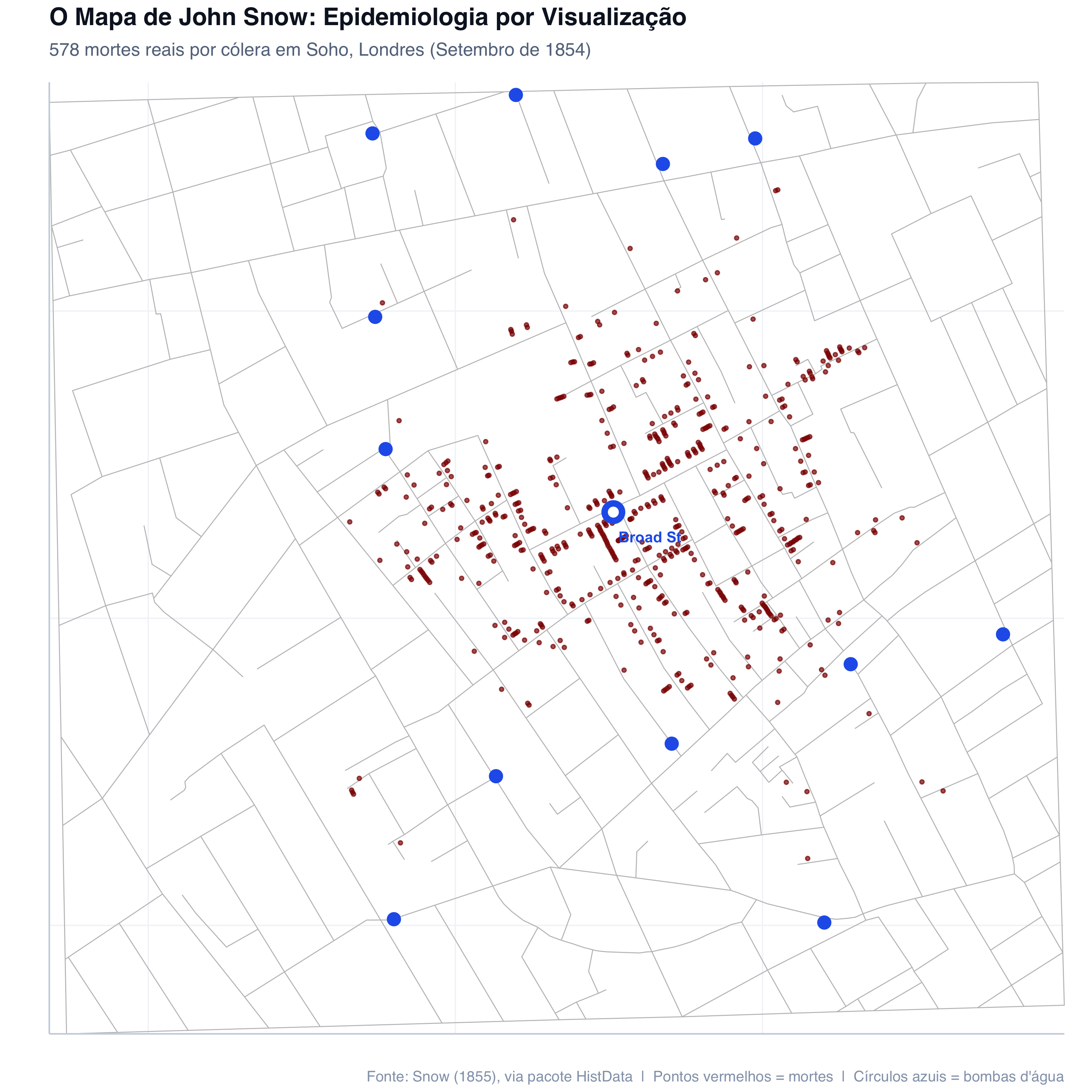 # Dados históricos reais de John Snow (1854)# Fonte: pacote HistData (Friendly, 2021), digitalizados por# Rusty Dodson (NCGIA, 1992) a partir do mapa original de Snow.# Coordenadas em unidades de ~100 metros.data(Snow.deaths)data(Snow.pumps)data(Snow.streets)# Separar bomba de Broad Street das demaisbroad_st <- Snow.pumps[Snow.pumps$pump ==7, ]outras_bombas <- Snow.pumps[Snow.pumps$pump !=7, ]# Criar o mapagrafico_snow <-ggplot() +# Ruas de Soho como fundogeom_path(data = Snow.streets,aes(x = x, y = y, group = street),color ="gray75", linewidth =0.3 ) +# 578 mortes reais por cólera (pontos menores para mostrar densidade)geom_point(data = Snow.deaths,aes(x = x, y = y),color ="#8b0000", size =0.9, alpha =0.7 ) +# Outras 12 bombas d'águageom_point(data = outras_bombas,aes(x = x, y = y),color ="#2563EB", size =4, shape =16 ) +# Bomba de Broad Street (destacada)geom_point(data = broad_st,aes(x = x, y = y),color ="#2563EB", size =7, shape =16 ) +geom_point(data = broad_st,aes(x = x, y = y),color ="white", size =3, shape =16 ) +annotate("text",x = broad_st$x +0.6, y = broad_st$y -0.4,label ="Broad St",fontface ="bold", color ="#2563EB", size =3.5 ) +labs(title ="O Mapa de John Snow: Epidemiologia por Visualização",subtitle ="578 mortes reais por cólera em Soho, Londres (Setembro de 1854)",x ="", y ="",caption ="Fonte: Snow (1855), via pacote HistData | Pontos vermelhos = mortes | Círculos azuis = bombas d'água" ) +tema_graficos() +theme(legend.position ="none",axis.text =element_blank(),axis.ticks =element_blank(),plot.title =element_text(size =16, face ="bold"),plot.subtitle =element_text(size =12),plot.margin =margin(5, 5, 5, 5) ) +coord_equal(expand =FALSE, clip ="off")print(grafico_snow)