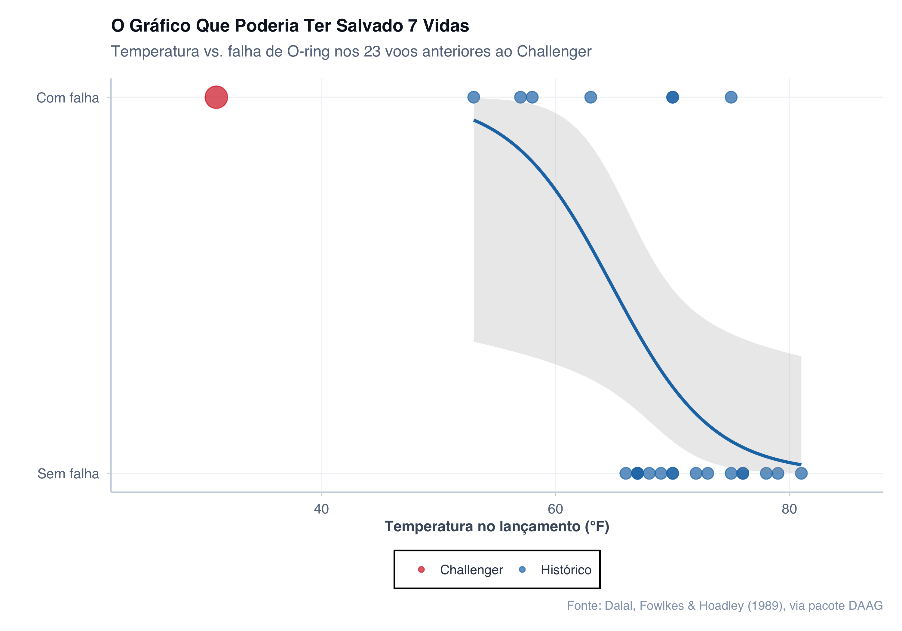 # Dados históricos reais dos O-rings do Space Shuttle# Fonte: pacote DAAG (Maindonald & Braun), originalmente de# Dalal, Fowlkes & Hoadley (1989). Risk Analysis of the Space Shuttle:# Pre-Challenger Prediction of Failure. JASA, 84(408), 945-957.library(DAAG)data(orings)# Preparar dados: variável binária de falha + adicionar o voo do Challengerdados_challenger <- orings %>%transmute(temperatura = Temperature,danos = Total,falha =as.integer(Total >0),tipo ="Histórico" ) %>%bind_rows(tibble(temperatura =31, danos =6, falha =1, tipo ="Challenger") )# O gráfico que poderia ter salvado 7 vidas:# todos os 23 voos anteriores + o ponto do Challengergrafico_challenger <- dados_challenger %>%ggplot(aes(x = temperatura, y = falha, color = tipo, size = tipo)) +geom_point(alpha =0.7) +geom_smooth(data = dados_challenger %>%filter(tipo =="Histórico"),method ="glm",method.args =list(family ="binomial"),se =TRUE,color ="#1f77b4",linewidth =1.2,alpha =0.2 ) +scale_color_manual(values =c("Histórico"="#1f77b4", "Challenger"="#d62728"),name ="" ) +scale_size_manual(values =c("Histórico"=4, "Challenger"=8),guide ="none" ) +xlim(25, 85) +scale_y_continuous(breaks =c(0, 1),labels =c("Sem falha", "Com falha") ) +labs(title ="O Gráfico Que Poderia Ter Salvado 7 Vidas",subtitle ="Temperatura vs. falha de O-ring nos 23 voos anteriores ao Challenger",x ="Temperatura no lançamento (°F)",y ="",caption ="Fonte: Dalal, Fowlkes & Hoadley (1989), via pacote DAAG" ) +tema_graficos() +theme(plot.title =element_text(size =14, face ="bold"),legend.position ="bottom" )print(grafico_challenger)