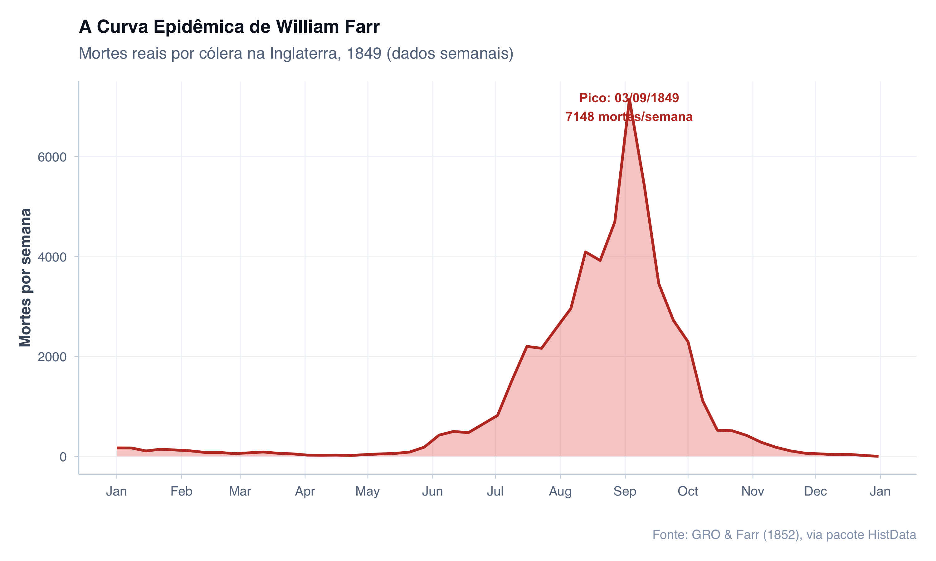 # Dados históricos reais de William Farr (1852)# Fonte: pacote HistData (Friendly, 2021), compilados a partir de# GRO & Farr (1852). Report on the Mortality of Cholera in England, 1848-49.# Mortes diárias por cólera e diarreia na Inglaterra, 1849.data(CholeraDeaths1849)# Agregar mortes semanais de cólera (suaviza o ruído diário)dados_farr <- CholeraDeaths1849 %>%filter(cause_of_death =="Cholera") %>%mutate(semana =as.Date(cut(date, breaks ="week"))) %>%group_by(semana) %>%summarise(mortes =sum(deaths), .groups ="drop")# Identificar o pico da epidemiapico <- dados_farr %>%filter(mortes ==max(mortes))grafico_farr <- dados_farr %>%ggplot(aes(x = semana, y = mortes)) +geom_area(fill ="#e74c3c", alpha =0.3) +geom_line(color ="#c0392b", linewidth =1) +annotate("text",x = pico$semana, y = pico$mortes -150,label =paste0("Pico: ", format(pico$semana, "%d/%m/%Y"),"\n", pico$mortes, " mortes/semana"),fontface ="bold",color ="#c0392b",size =3.5,hjust =0.5 ) +scale_x_date(date_labels ="%b", date_breaks ="1 month") +labs(title ="A Curva Epidêmica de William Farr",subtitle ="Mortes reais por cólera na Inglaterra, 1849 (dados semanais)",x ="",y ="Mortes por semana",caption ="Fonte: GRO & Farr (1852), via pacote HistData" ) +tema_graficos() +theme(plot.title =element_text(size =14, face ="bold"),axis.text =element_text(size =10) )print(grafico_farr)