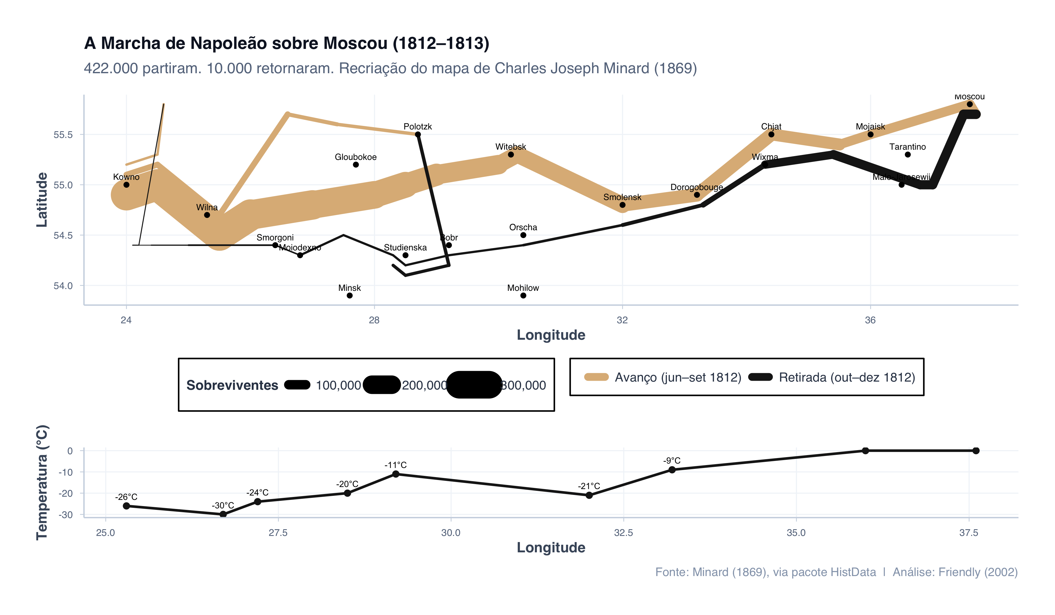 # Dados históricos reais de Charles Joseph Minard (1869)# Fonte: pacote HistData (Friendly, 2021), digitalizados a partir do# mapa original de Minard por Michael Friendly.data(Minard.troops)data(Minard.cities)data(Minard.temp)# Painel superior: o mapa da marchap_marcha <-ggplot() +# Faixas do exército (largura = número de sobreviventes)geom_path(data = Minard.troops,aes(x = long, y = lat, group = group,color = direction, linewidth = survivors),lineend ="round" ) +# Nomes das cidadesgeom_point(data = Minard.cities,aes(x = long, y = lat),color ="black", size =1.5 ) +geom_text(data = Minard.cities,aes(x = long, y = lat, label = city),size =2.5, vjust =-0.8, family ="sans" ) +scale_color_manual(values =c("A"="#DEB887", "R"="#1a1a1a"),labels =c("Avanço (jun–set 1812)", "Retirada (out–dez 1812)"),name ="" ) +scale_linewidth_continuous(range =c(0.3, 12),labels = scales::comma,name ="Sobreviventes" ) +labs(title ="A Marcha de Napoleão sobre Moscou (1812–1813)",subtitle ="422.000 partiram. 10.000 retornaram. Recriação do mapa de Charles Joseph Minard (1869)",x ="Longitude",y ="Latitude" ) +tema_graficos() +theme(legend.position ="bottom",plot.title =element_text(size =14, face ="bold"),axis.text =element_text(size =8) ) +guides(linewidth =guide_legend(order =1),color =guide_legend(order =2, override.aes =list(linewidth =3)) )# Painel inferior: temperaturas durante a retiradap_temp <-ggplot(Minard.temp, aes(x = long, y = temp)) +geom_path(color ="#1a1a1a", linewidth =1) +geom_point(color ="#1a1a1a", size =2) +geom_text(aes(label =paste0(temp, "°C")),size =2.5, vjust =-1 ) +labs(x ="Longitude",y ="Temperatura (°C)",caption ="Fonte: Minard (1869), via pacote HistData | Análise: Friendly (2002)" ) +tema_graficos() +theme(axis.text =element_text(size =8))# Combinar os dois painéislibrary(patchwork)grafico_minard <- p_marcha / p_temp +plot_layout(heights =c(3, 1))print(grafico_minard)
