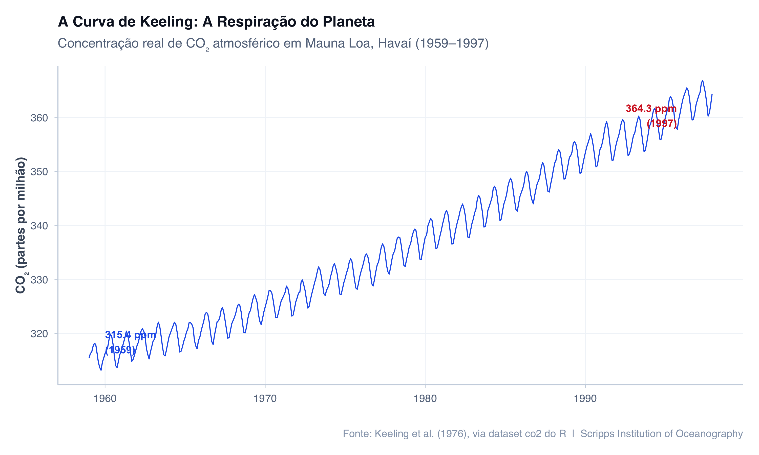 # Dados reais de CO2 atmosférico do Observatório de Mauna Loa# Fonte: dataset co2 do R base — médias mensais de Jan/1959 a Dez/1997# Originalmente coletados por Charles David Keeling e colaboradores,# Scripps Institution of Oceanography, UCSD.# Converter a série temporal em data framedados_co2 <-data.frame(data =seq(as.Date("1959-01-01"), by ="month", length.out =length(co2)),co2 =as.numeric(co2))# Primeiro e último valores para anotaçãoprimeiro <- dados_co2[1, ]ultimo <- dados_co2[nrow(dados_co2), ]grafico_keeling <- dados_co2 %>%ggplot(aes(x = data, y = co2)) +geom_line(color ="#2563EB", linewidth =0.5) +# Anotação do valor inicialannotate("text",x = primeiro$data +365, y = primeiro$co2 +3,label =paste0(round(primeiro$co2, 1), " ppm\n(1959)"),color ="#2563EB", size =3.5, fontface ="bold", hjust =0 ) +# Anotação do valor finalannotate("text",x = ultimo$data -800, y = ultimo$co2 -4,label =paste0(round(ultimo$co2, 1), " ppm\n(1997)"),color ="#d62728", size =3.5, fontface ="bold", hjust =1 ) +labs(title ="A Curva de Keeling: A Respiração do Planeta",subtitle ="Concentração real de CO₂ atmosférico em Mauna Loa, Havaí (1959–1997)",x ="",y ="CO₂ (partes por milhão)",caption ="Fonte: Keeling et al. (1976), via dataset co2 do R | Scripps Institution of Oceanography" ) +tema_graficos() +theme(plot.title =element_text(size =14, face ="bold"),axis.text =element_text(size =10) )print(grafico_keeling)
