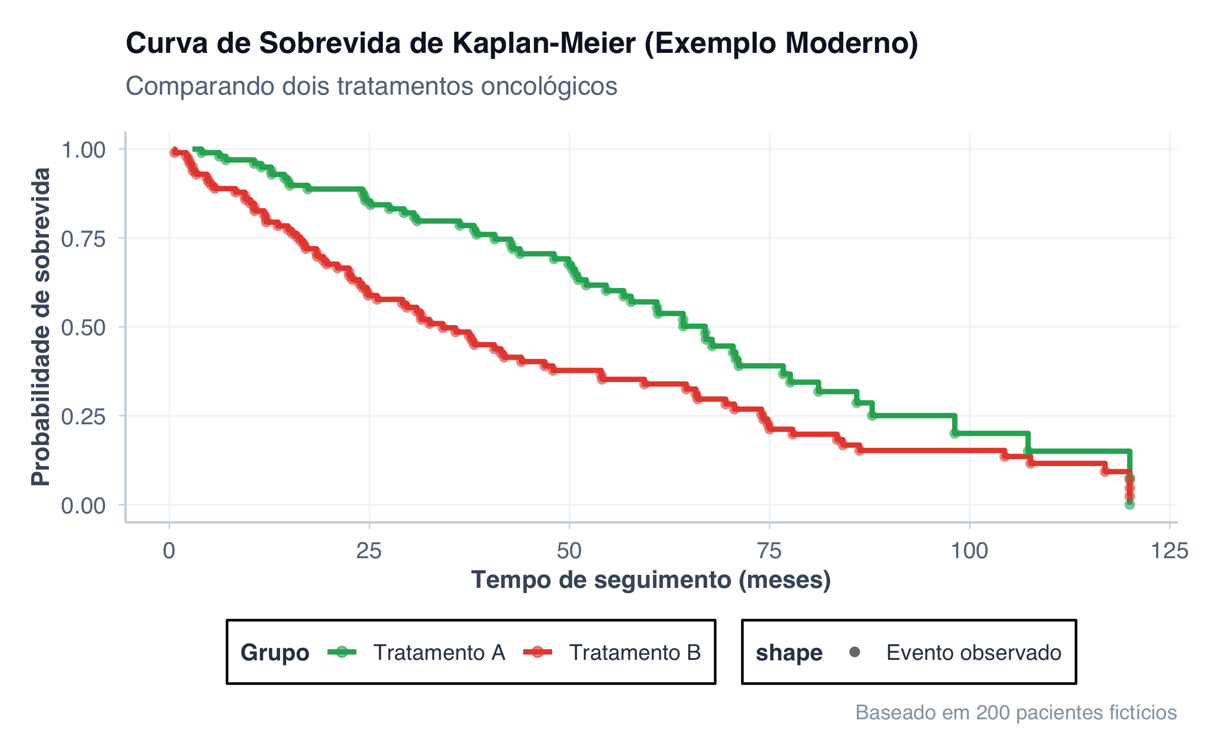 # Simular dados de sobrevida (Kaplan-Meier)set.seed(100)n_pacientes <-200dados_km <-tibble(id =1:n_pacientes,tempo_meses =c(rweibull(100, shape =1.5, scale =60), # Tratamento A (melhor)rweibull(100, shape =1.2, scale =40) # Tratamento B ),evento =c(rbinom(100, 1, 0.6), # Taxa de evento 60% em tratamento Arbinom(100, 1, 0.75) # Taxa de evento 75% em tratamento B ),tratamento =c(rep("Tratamento A", 100), rep("Tratamento B", 100))) %>%mutate(tempo_meses =pmin(tempo_meses, 120)) # Máximo 120 meses de seguimento# Calcular a curva de Kaplan-Meier (aproximação)km_stats <- dados_km %>%arrange(tratamento, tempo_meses) %>%group_by(tratamento) %>%mutate(n_em_risco =n() -row_number() +1,eventos_acumulados =cumsum(evento),sobrevida =cumprod(1- (evento / n_em_risco)) )grafico_km <- km_stats %>%ggplot(aes(x = tempo_meses, y = sobrevida, color = tratamento)) +geom_step(linewidth =1.2) +geom_point(aes(shape ="Evento observado"),data = km_stats %>%filter(evento ==1),size =2, alpha =0.6) +scale_color_manual(values =c("Tratamento A"="#27ae60", "Tratamento B"="#e74c3c"),name ="Grupo" ) +labs(title ="Curva de Sobrevida de Kaplan-Meier (Exemplo Moderno)",subtitle ="Comparando dois tratamentos oncológicos",x ="Tempo de seguimento (meses)",y ="Probabilidade de sobrevida",caption ="Baseado em 200 pacientes fictícios" ) +tema_graficos() +theme(plot.title =element_text(size =14, face ="bold"),legend.position ="bottom" ) +ylim(0, 1)print(grafico_km)