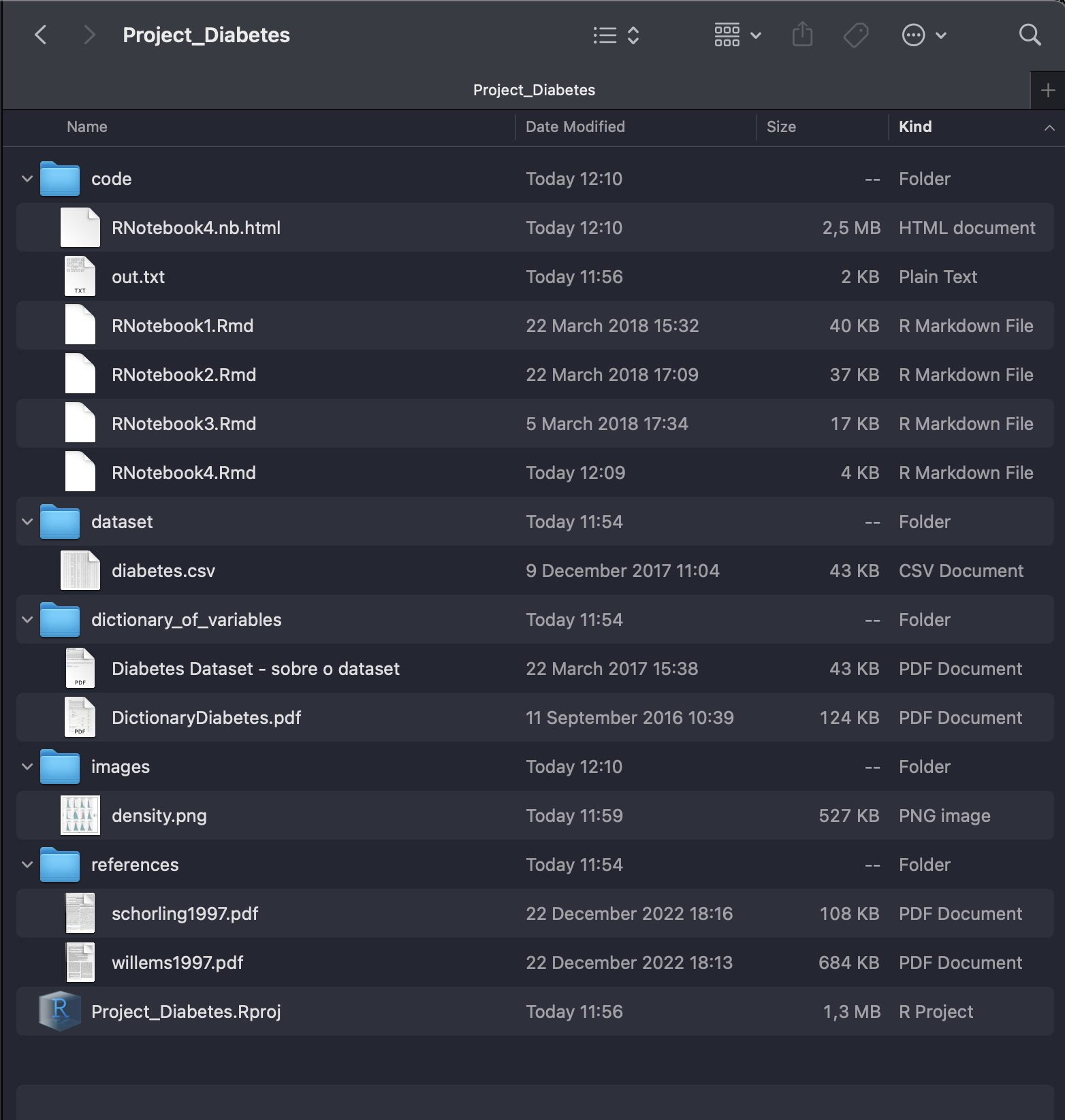 Em geral uma pesquisa possui um monte de arquivos. Temos arquivos com os dados brutos, arquivos com dados modificados, arquivos em formatos específicos tal como Excel, Word, PDFs, artigos de referências, imagens, gráficos etc. Colocar tudo isso numa única pasta do projeto não é uma boa prática. A pasta do projeto fica caótica.