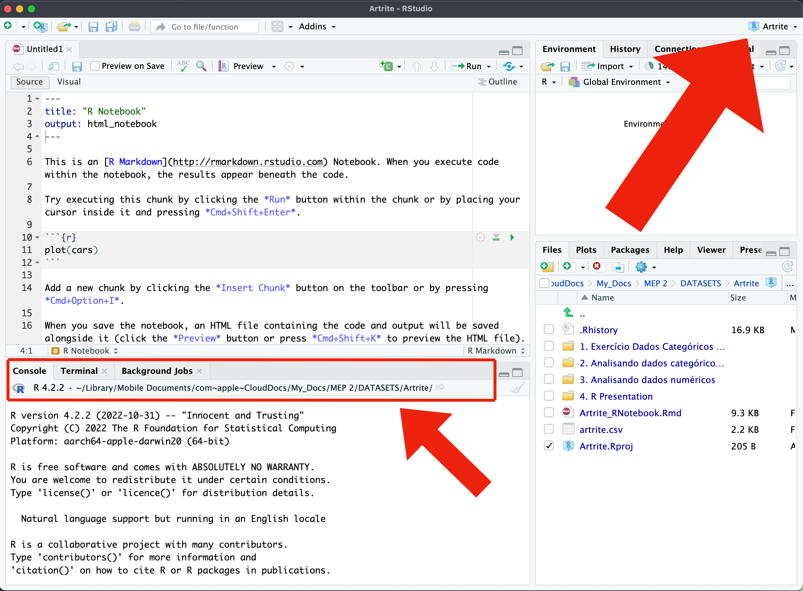 O nome do seu projeto aparece na barra na parte superior RStudio, e o caminho completo do diretório de trabalho aparece na barra superior do painel Console, como mostra a figura abaixo.