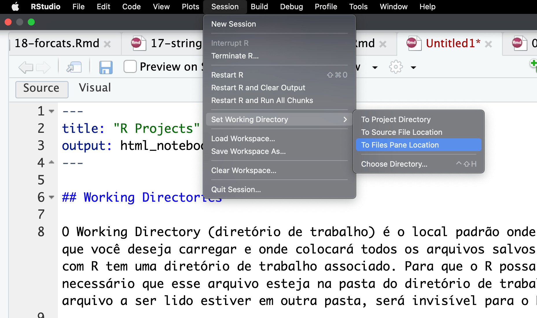 Além dessas funções, você pode mudar o diretório de trabalho diretamente no menu do RStudio.
